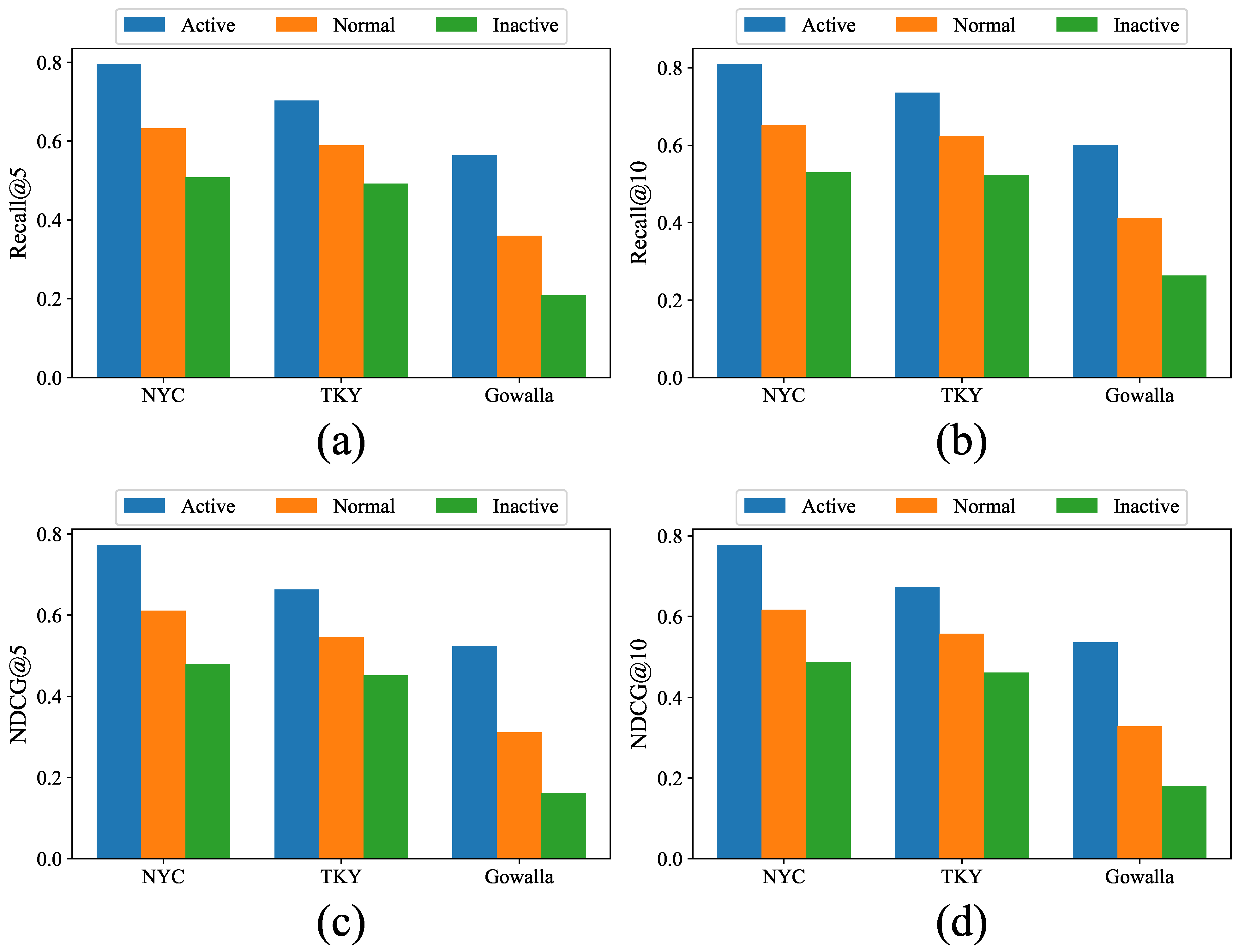 To investigate whether the proposed model can alleviate the data sparsity issue in next POI recommendation, we design two types of sparsity evaluation experiments. The first experiment is conducted at the user level. Users are divided into three groups based on the number of complete trajectories in the training set, with the top 30% considered active users, the bottom 30% considered inactive users, and the rest are normal users. Moreover, all samples belonging to the same user in the test set inherit that user’s activity category. The second experiment is sample-level, where groups are determined by the trajectory length of each test sample. Specifically, the top 30% of samples are classified as active samples, the bottom 30% as inactive samples, and the remaining as normal samples. Unlike the user-level setting, this allows samples from the same user to fall into different groups.