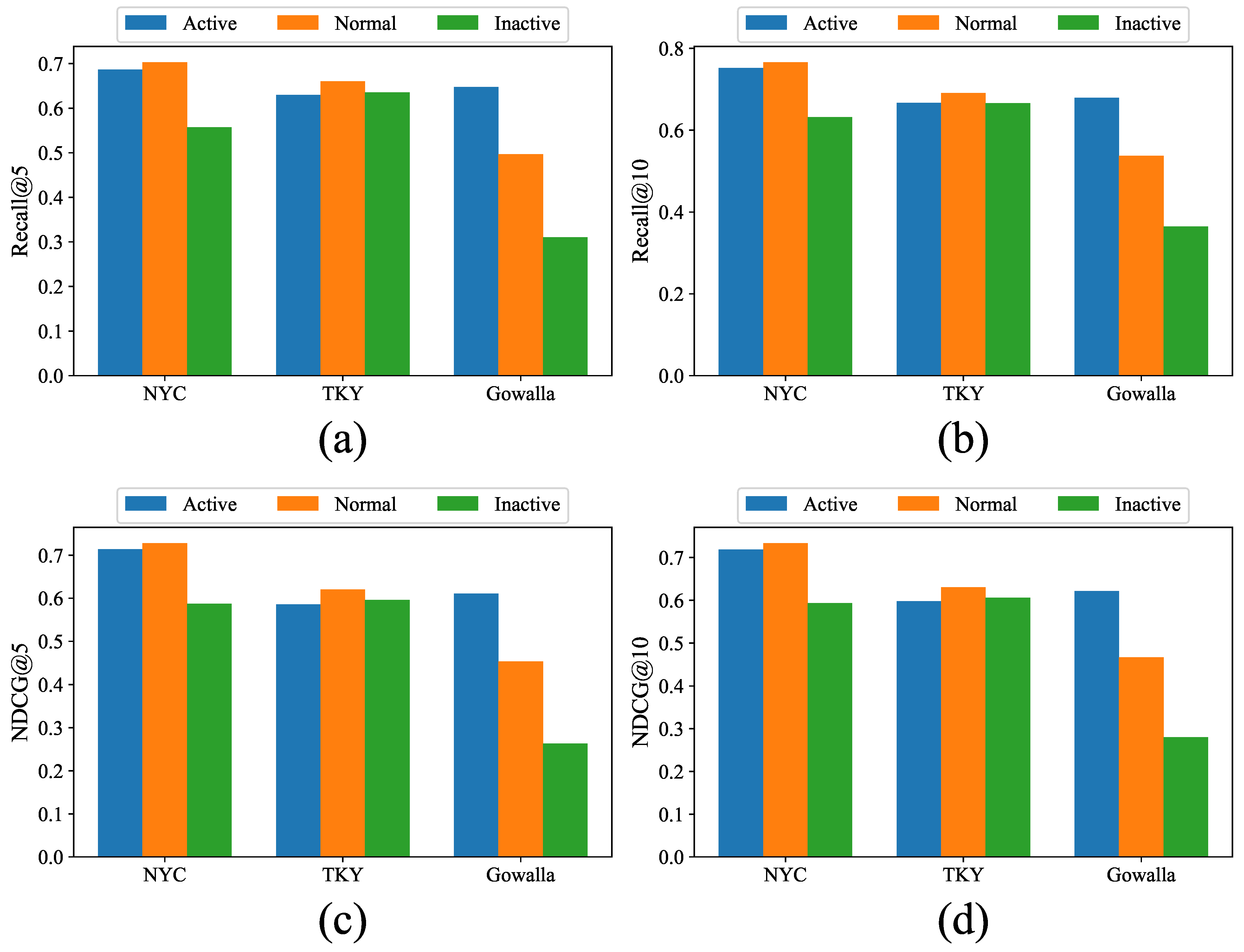 Figure 5, the user-level results reveal that active users consistently achieve the best performance across all datasets, while inactive users perform the worst, highlighting the challenge of modeling long-term inactive users. Normal users are situated between the two extremes, reflecting the model’s ability to partially generalize to users with moderate interaction histories. Moreover, the performance degradation is more pronounced on the Gowalla dataset, underscoring the severe challenges posed by extreme sparsity. These results indicate that the proposed model can effectively leverage rich interaction histories, while performance degradation under extreme user-level sparsity remains a common challenge for next POI recommendation models. Nevertheless, MRHL still maintains stable relative performance across datasets, suggesting a certain degree of robustness even in highly sparse and irregular user behavior settings.
