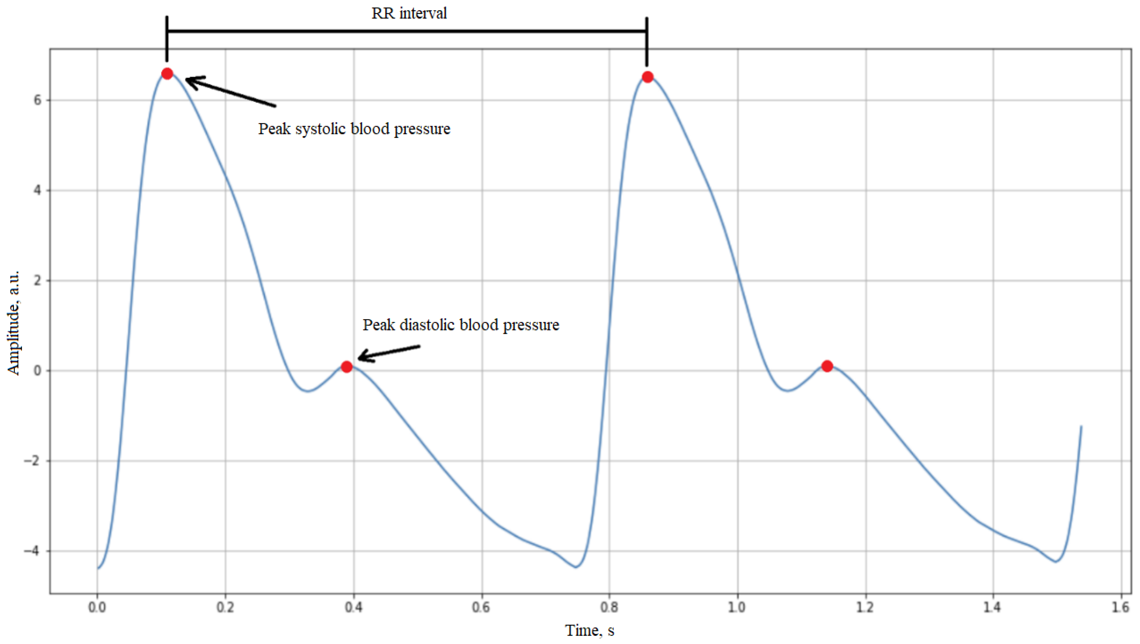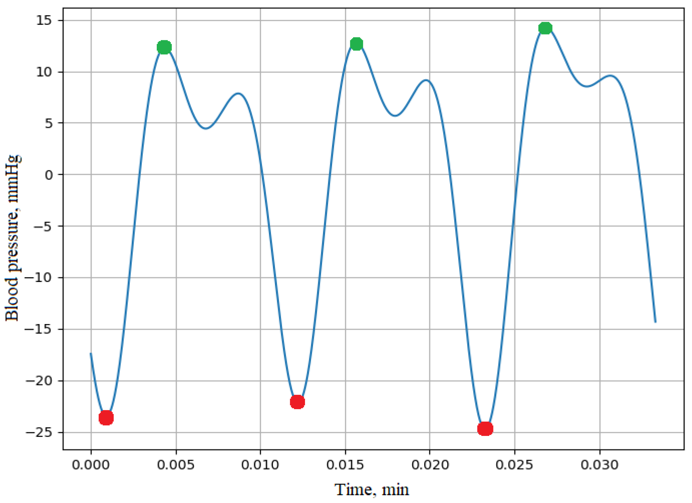 Figure 4 shows the points where DBP and SBP peaks are detected within the PPG signal sourced from the dataset. It is evident that the signal components were filtered, as significant distortions, which were present in