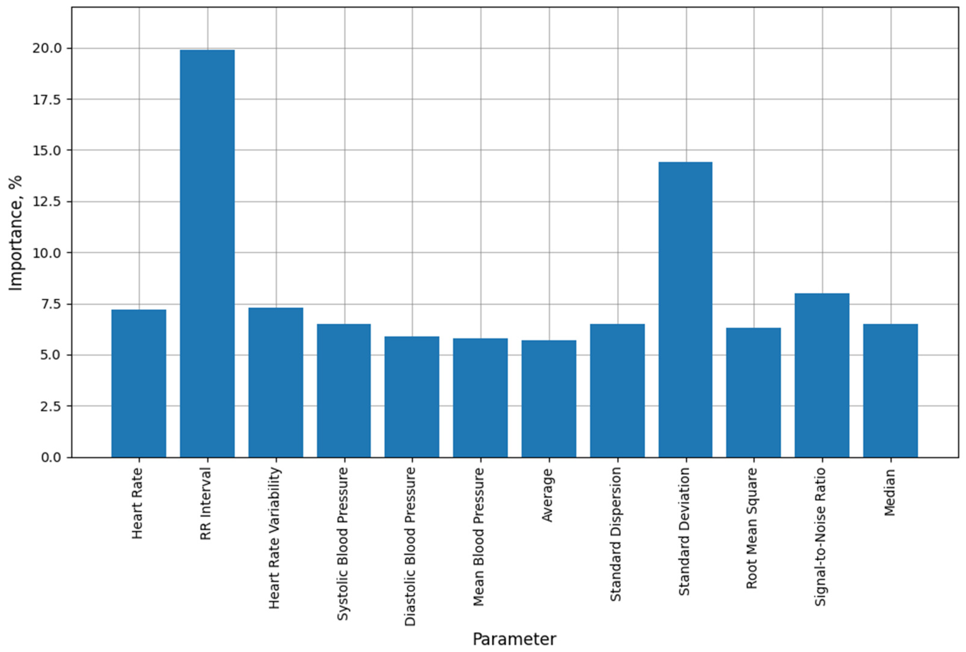Furthermore, from a signal processing perspective, these parameters exhibit high robustness against the specific noise profiles of a mouse-embedded PPG sensor. Real-world mouse usage introduces significant motion artifacts and variable skin contact pressure, which severely distort the amplitude of the PPG signal. Because the RR interval and SD are timing-based features (relying solely on the temporal detection of systolic peaks rather than absolute signal amplitude), they remain relatively stable even when the signal’s baseline wanders or its amplitude fluctuates. This explains why amplitude-dependent features, such as estimated systolic and diastolic blood pressure, ranked substantially lower in importance compared to robust temporal metrics.