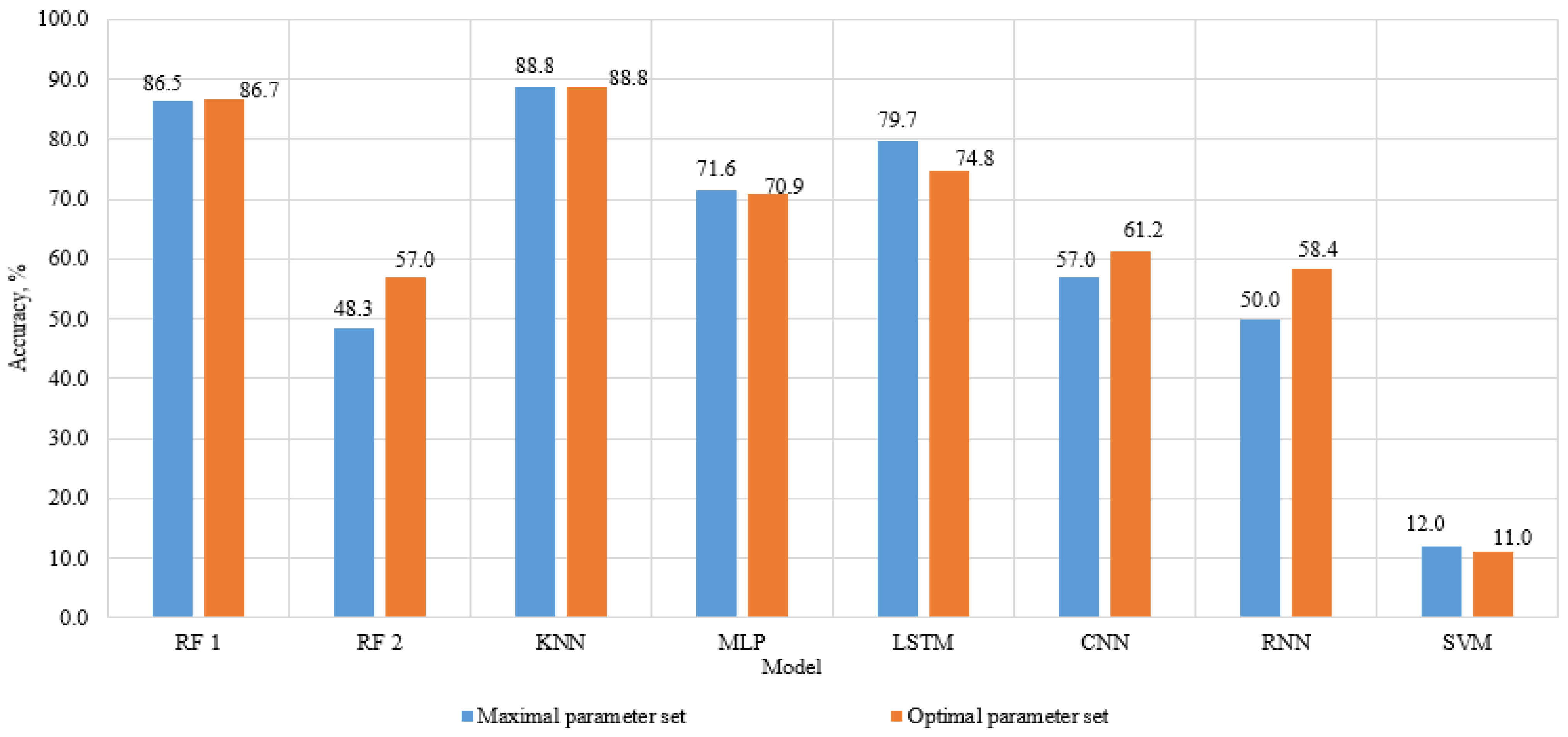Figure 6). The Random Forest (RF1) model slightly improved from 86.5% to 86.7%, indicating robustness and low overfitting. RF2 demonstrated a significant accuracy increase from 48.3% to 57.0%, showing a strong dependence on parameter tuning. The KNN model maintained a stable 88.8% accuracy, regardless of parameter count. The MLP saw a minor decrease from 71.6% to 70.9%, suggesting moderate stability. LSTM accuracy declined from 79.7% to 74.8% when optimized, suggesting that the more complex configuration performed better. CNN and RNN models improved notably—from 57.0% to 61.2% and from 50.0% to 58.4%, respectively—demonstrating a reliance on proper parameter configuration. The SVM model slightly decreased from 12.0% to 11.0% and remained the least accurate overall.