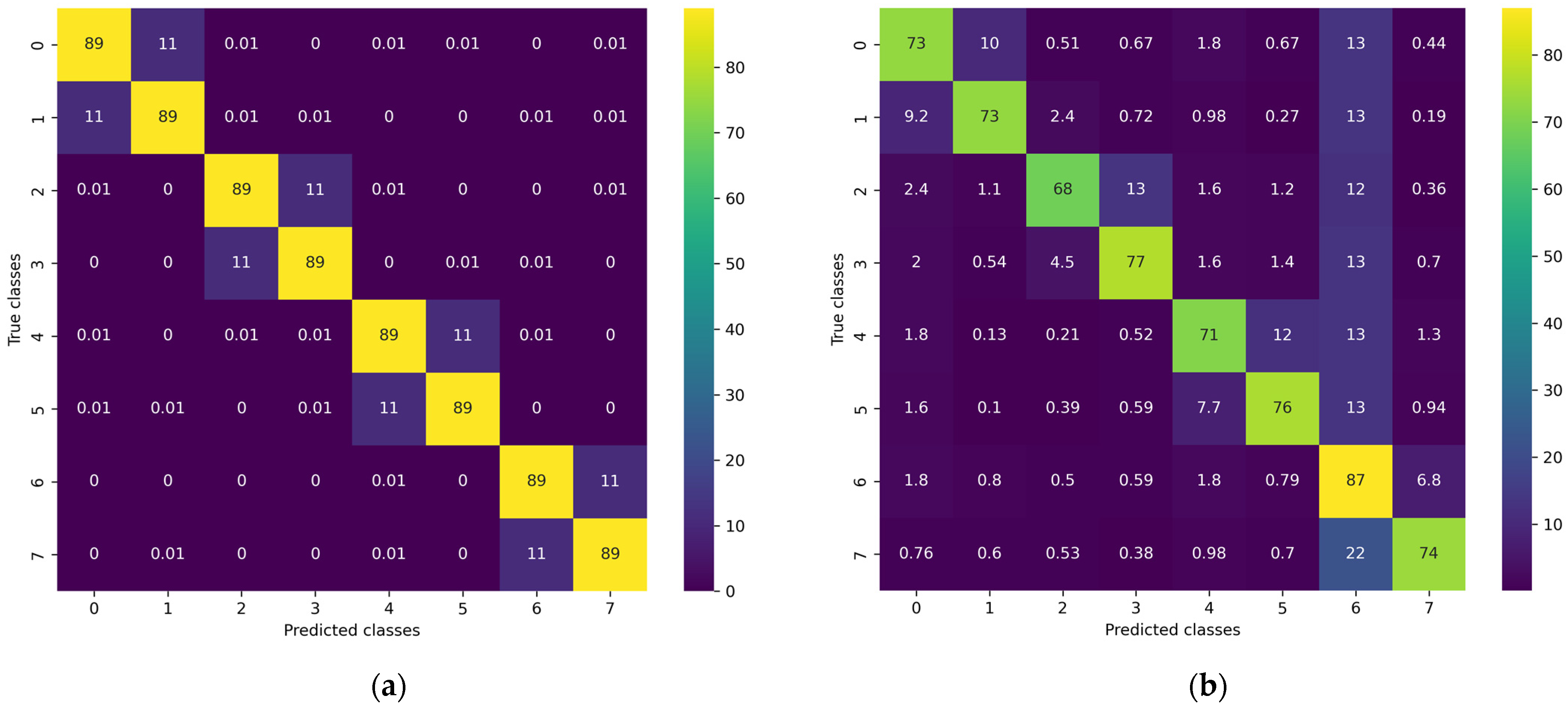 Conversely, the right matrix illustrates the performance of the optimized LSTM model, which was selected for the final embedded deployment due to its superior compression capabilities. While the LSTM matrix still demonstrates solid diagonal alignment, it reveals the realistic challenges of physiological signal classification. The model successfully distinguishes pronounced high-arousal emotions but exhibits noticeable cross-talk between specific affective states (e.g., instances of Class 6 being confused with Class 7).