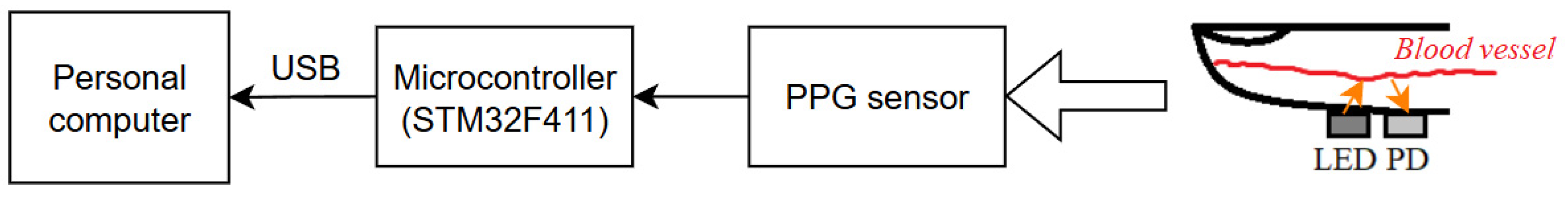 This section presents the deployment of trained models on an STM32F411 microcontroller. A photoplethysmography (PPG) heart rate sensor is attached to a computer mouse to measure the user’s pulse through the thumb. The analog signal is processed by the microcontroller, which extracts features and performs emotion recognition. The resulting classification output is then transmitted to a computer via USB. The block diagram (