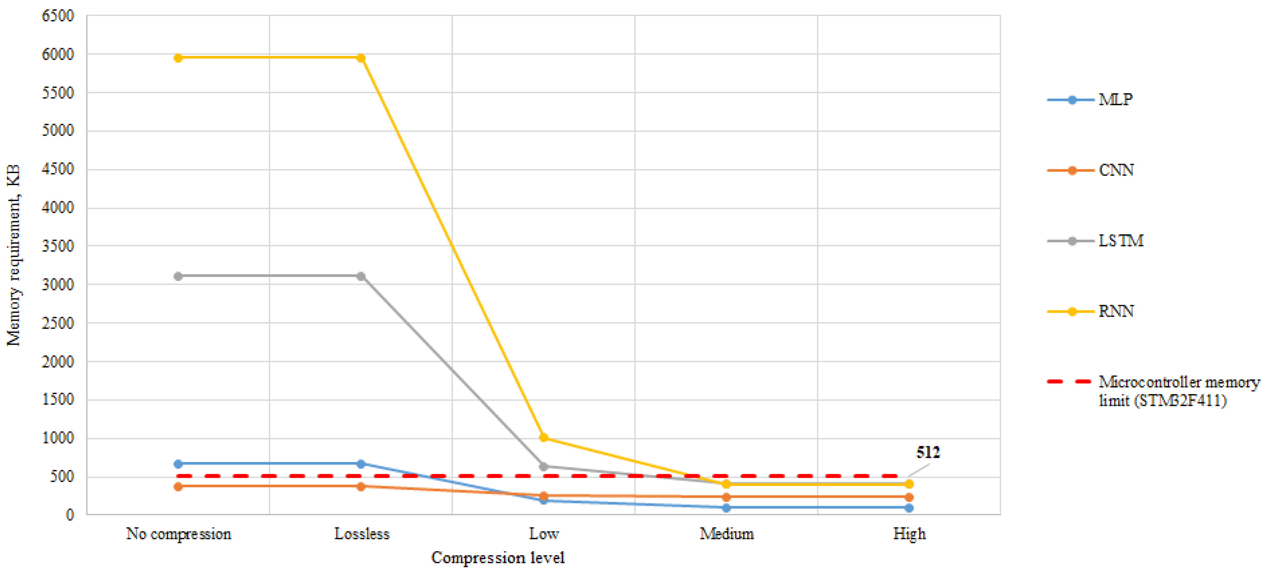 Despite the exclusion of RF, KNN, and SVM models due to excessive coefficient array sizes, the remaining models (MLP, CNN, LSTM, and RNN) still exceeded the STM32F411 microcontroller’s memory limits, requiring model compression.