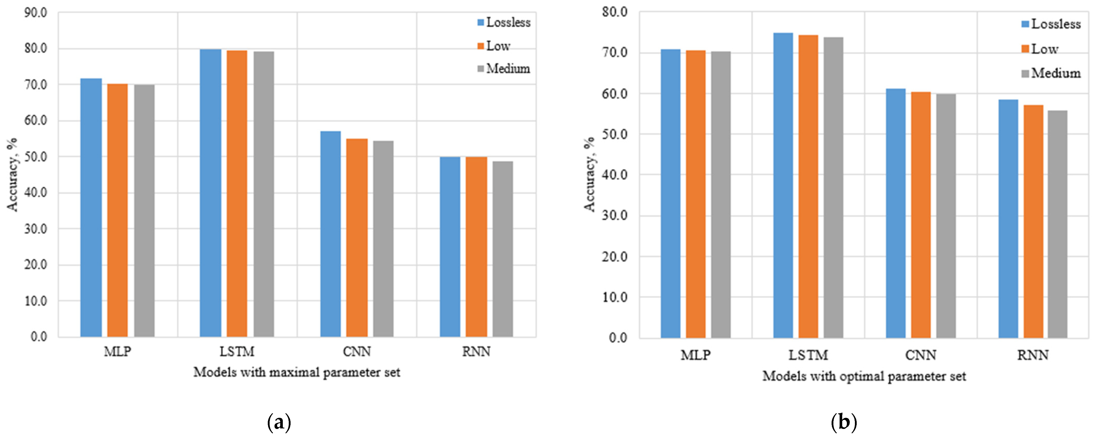 Figure 9 illustrates how memory usage varies depending on the applied compression level. A notable decrease in memory demand occurs when shifting from lossless to low compression. With low compression, memory usage was reduced to 196.58 KB for MLP, 258.54 KB for CNN, 639.84 KB for LSTM, and 1009.83 KB for RNN. However, LSTM and RNN still exceeded the 512 KB flash memory limit by 1.25× and 1.97×, respectively, and therefore required medium-level compression. Under high compression, the models consumed 100.78 KB (MLP), 236.67 KB (CNN), 411.62 KB (LSTM), and 403.66 KB (RNN), corresponding to approximately 19.7%, 46.2%, 80.4%, and 78.8% of the available flash memory. This demonstrates that compression is essential to enable model deployment on the microcontroller, and the required compression level depends on the specific model and the hardware constraints.