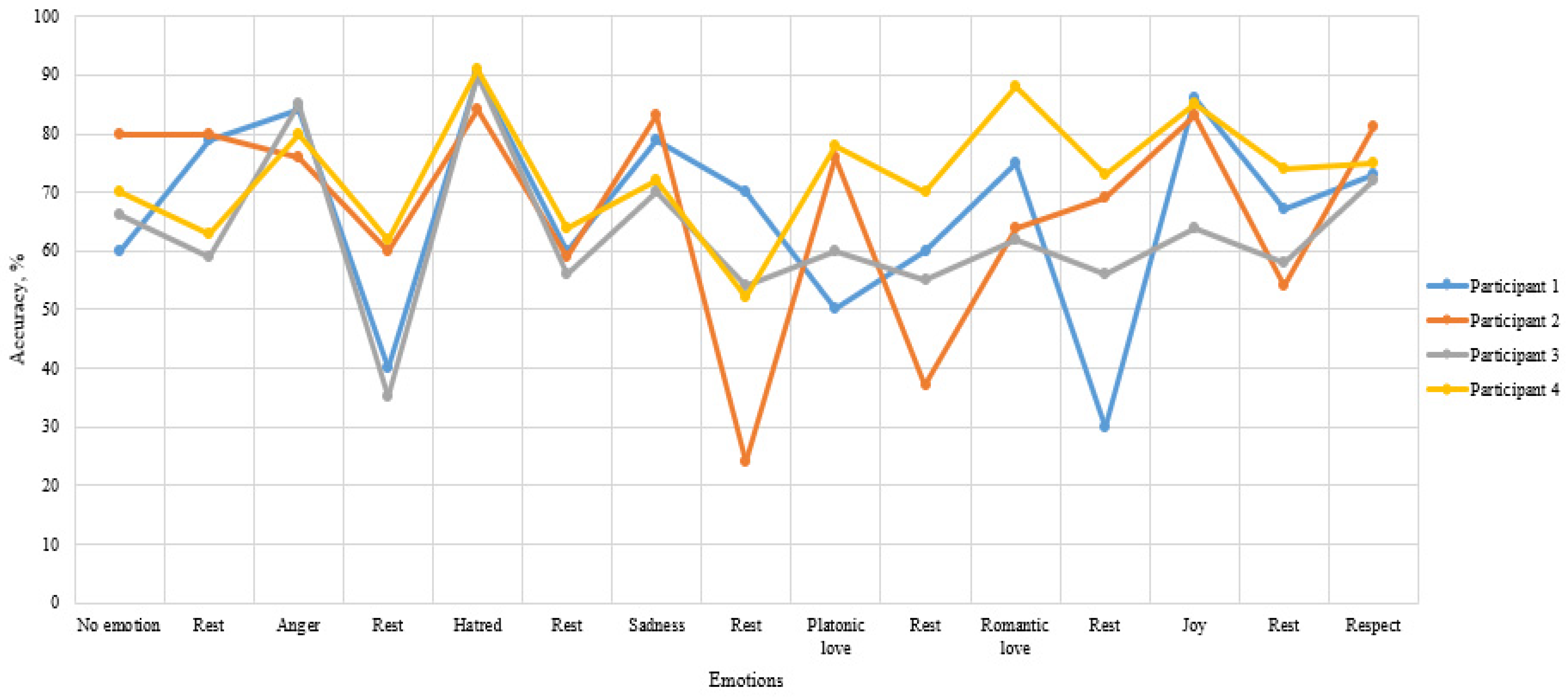Comparing participants, Participant 4 demonstrated the most stable performance, with high accuracy in hatred (91%), anger (80%), and romantic love (88%). Participant 1 also performed well for hatred (90%) and anger (84%) but had significant drops for more subtle emotions like platonic love. Participant 2 showed similar trends, with high accuracy for hatred (84%) but notable difficulties with romantic love (65%).