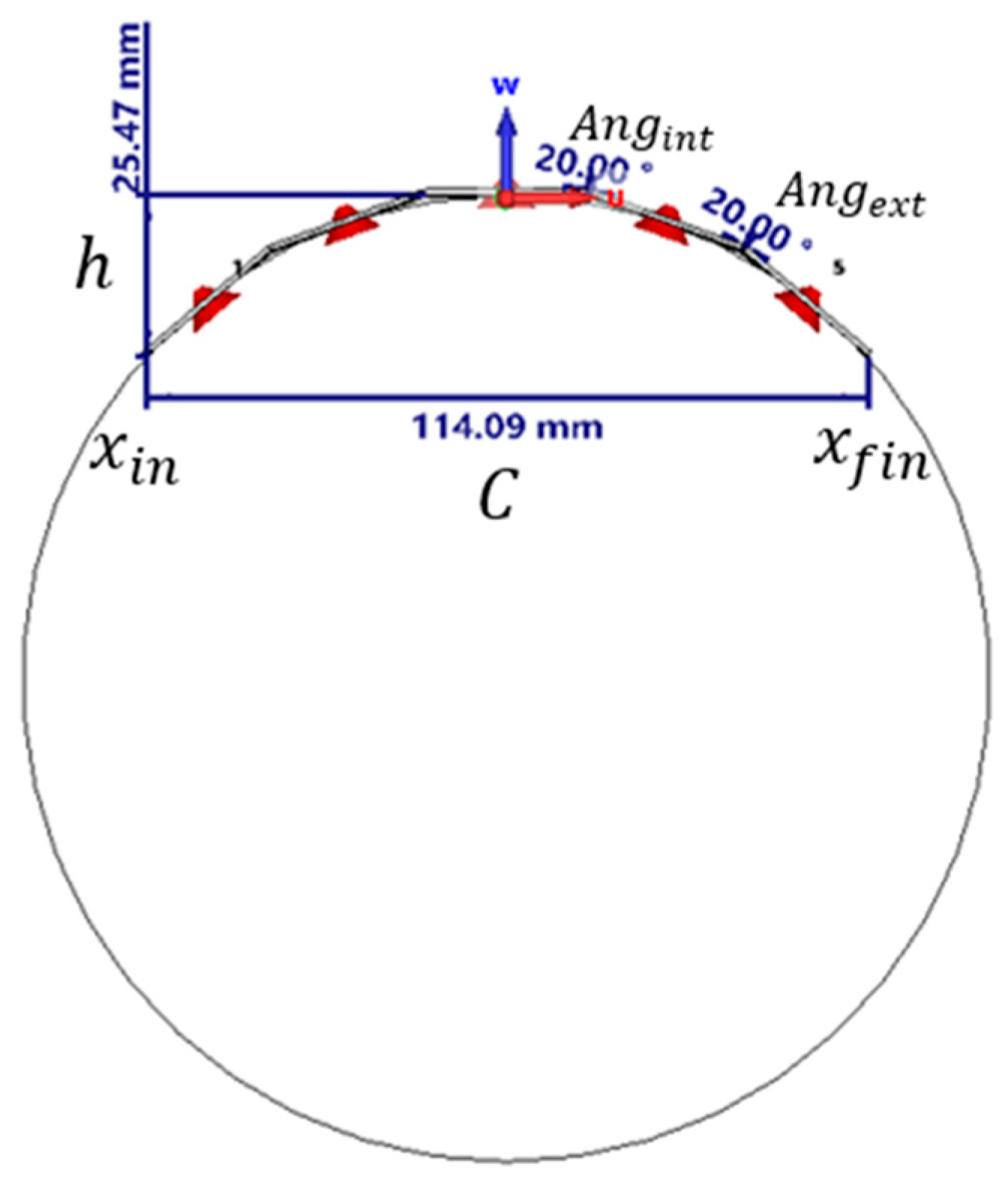 In this formulation, and correspond to the initial and final coordinates of the array along the x-axis, respectively, while represents the chord length of the equivalent arc and its height. The angle denotes the angle between the central element and its adjacent element, whereas corresponds to the angle between this adjacent element and the outer element.