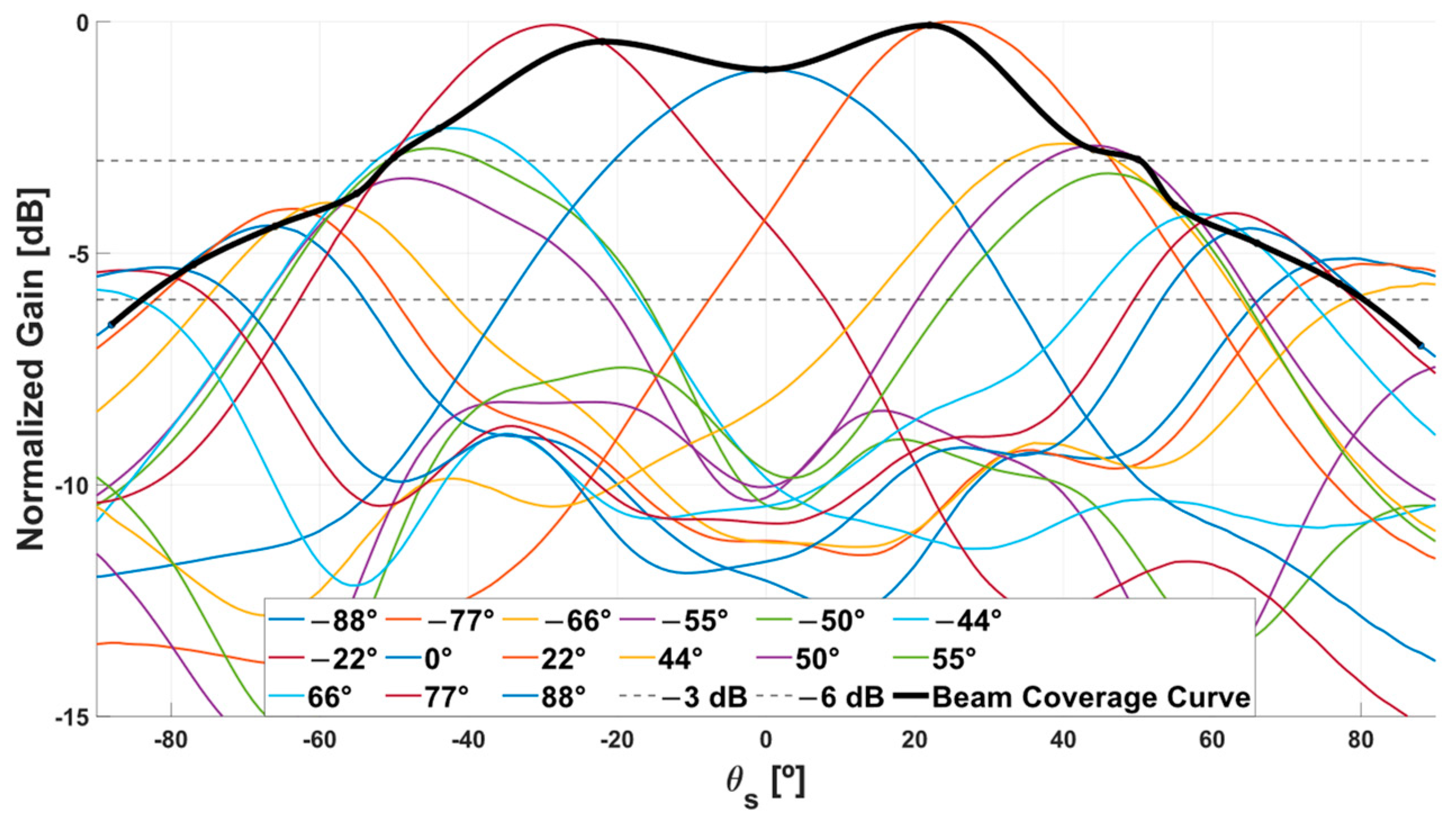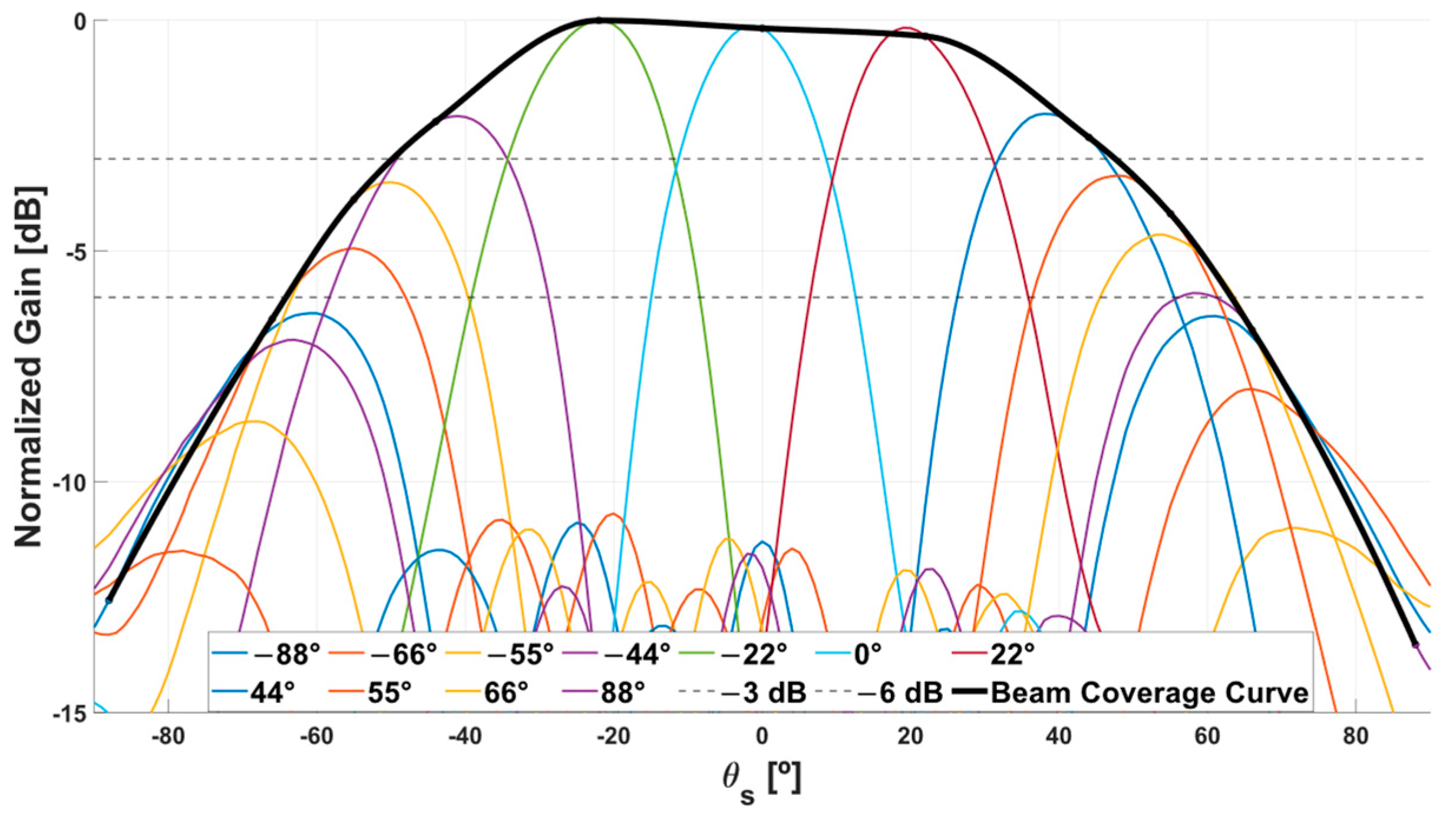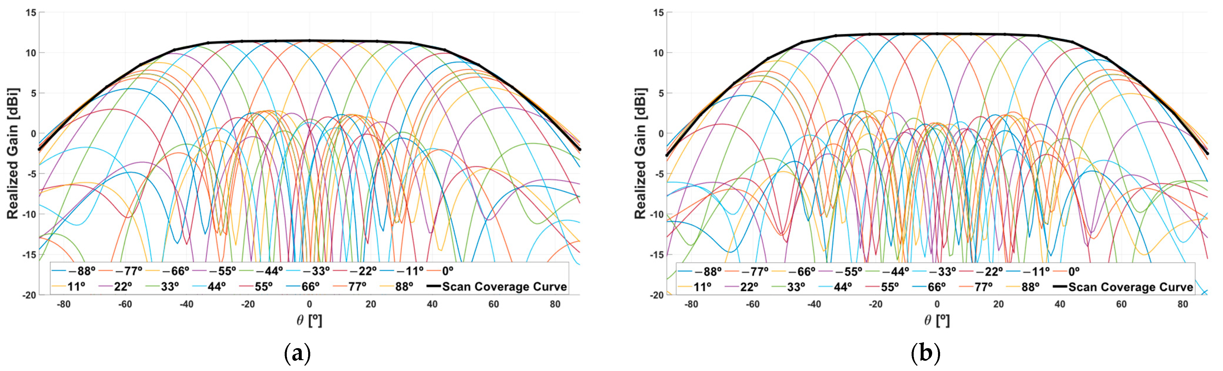 Figure 5b). These figures comprise the superposition of the various radiation patterns, making it possible to define an envelope curve that defines the coverage of the array. Coverage is defined by identifying the angular region over which the realized gain remains within 3 dB of the maximum gain at broadside.