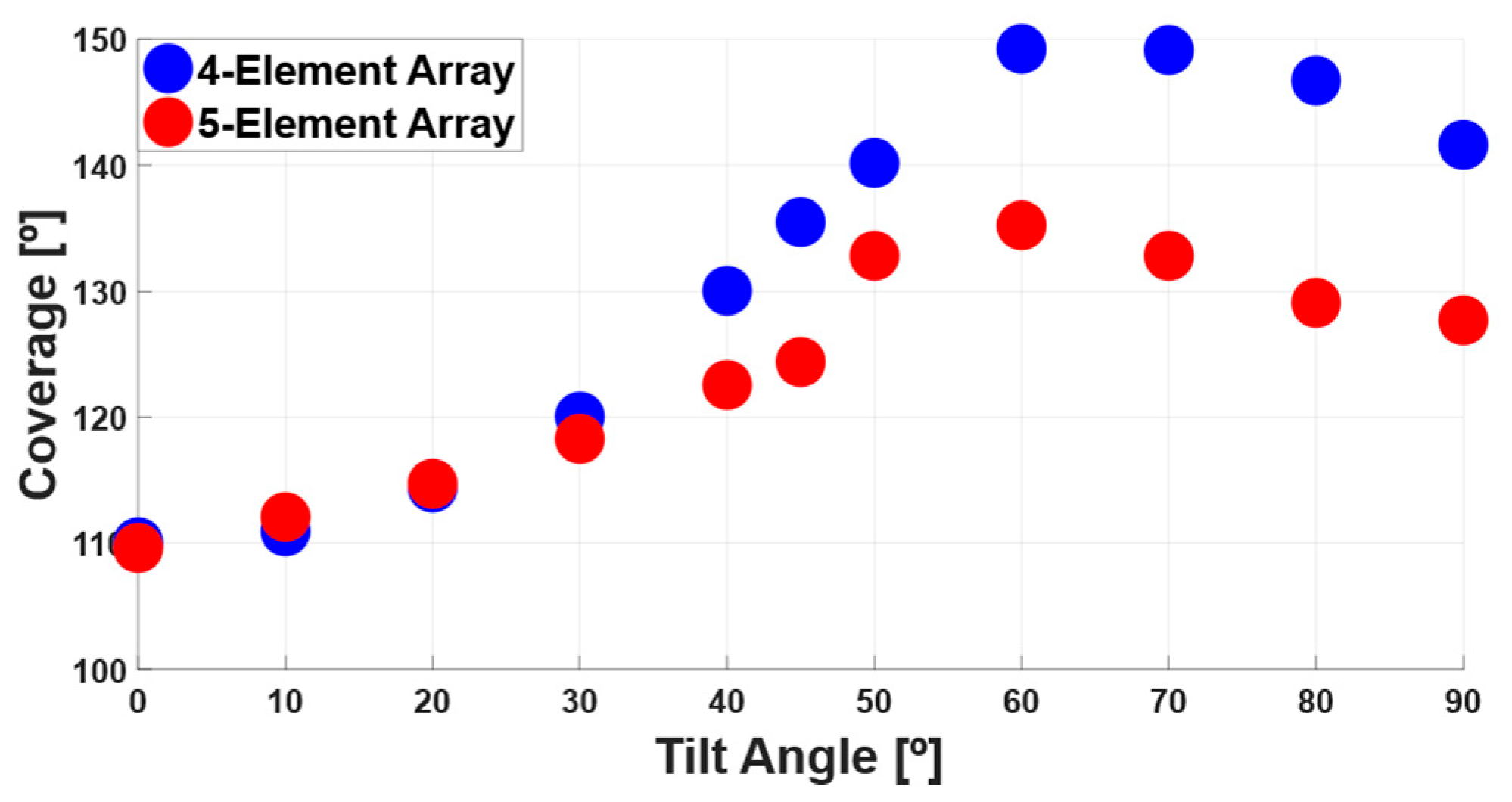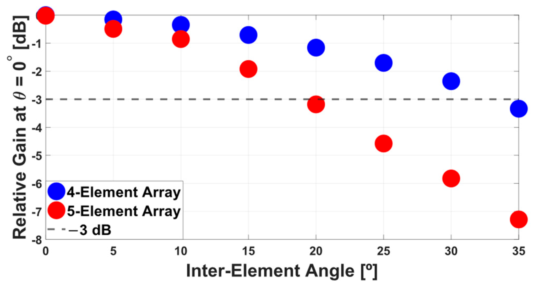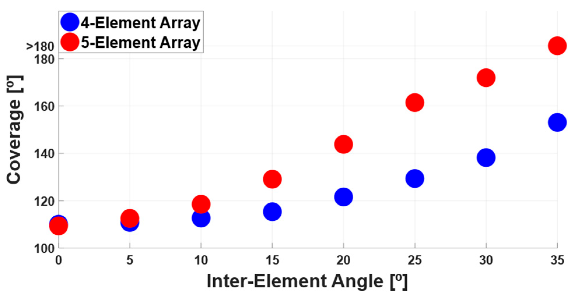 As the inter-element angle increases, the angular beam coverage also increases, reaching a maximum of approximately 153° for the four-element array and greater than 180° for the five-element array.