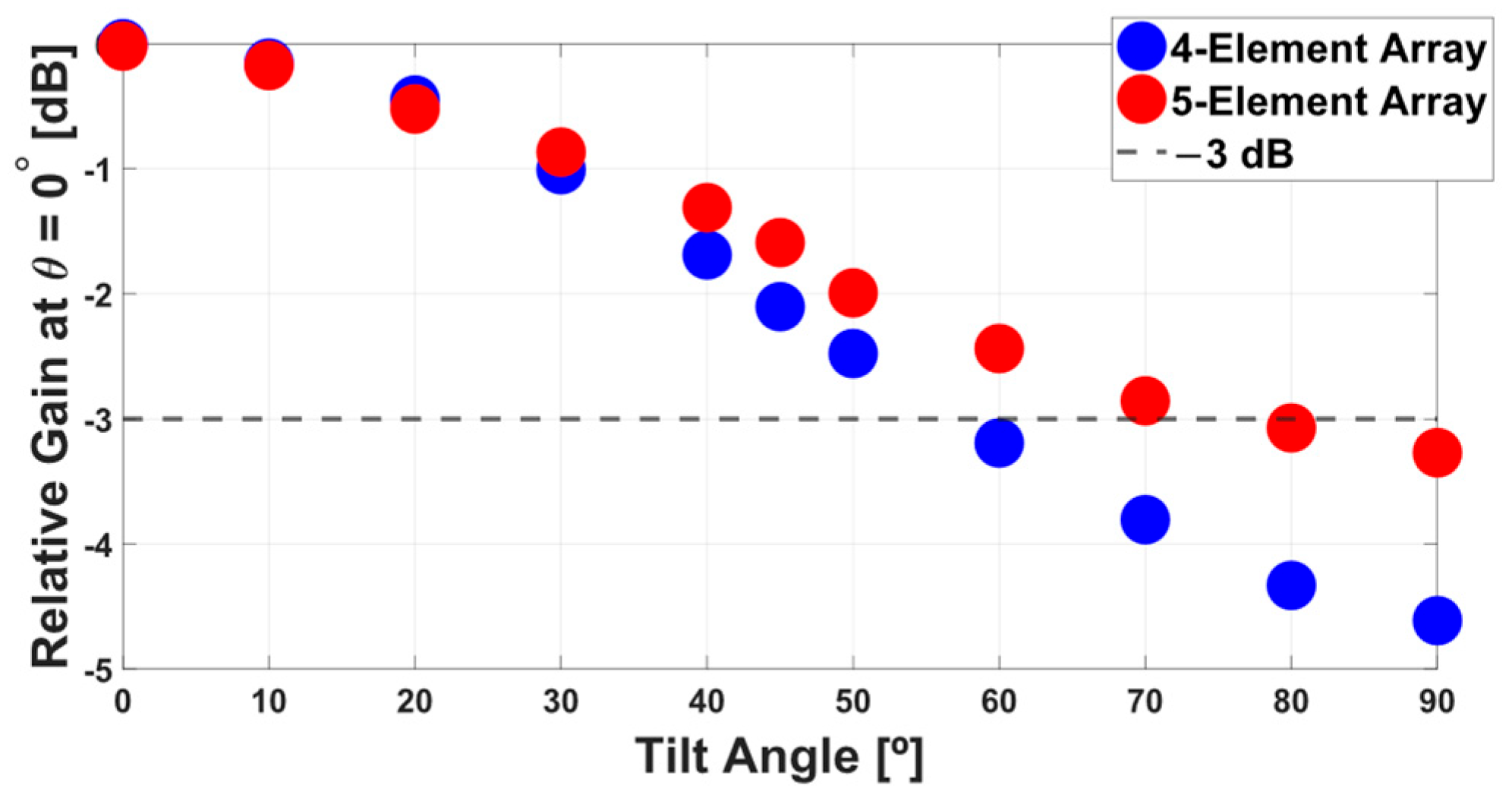Figure 7, it is evident that the five-element array exhibits a smaller maximum scan coverage compared to the four-element array but experiences less degradation in gain with increasing tilt. This is due to the presence of the central element in the five-element array, which remains aligned with the array normal and continues to contribute effectively to the boresight radiation.