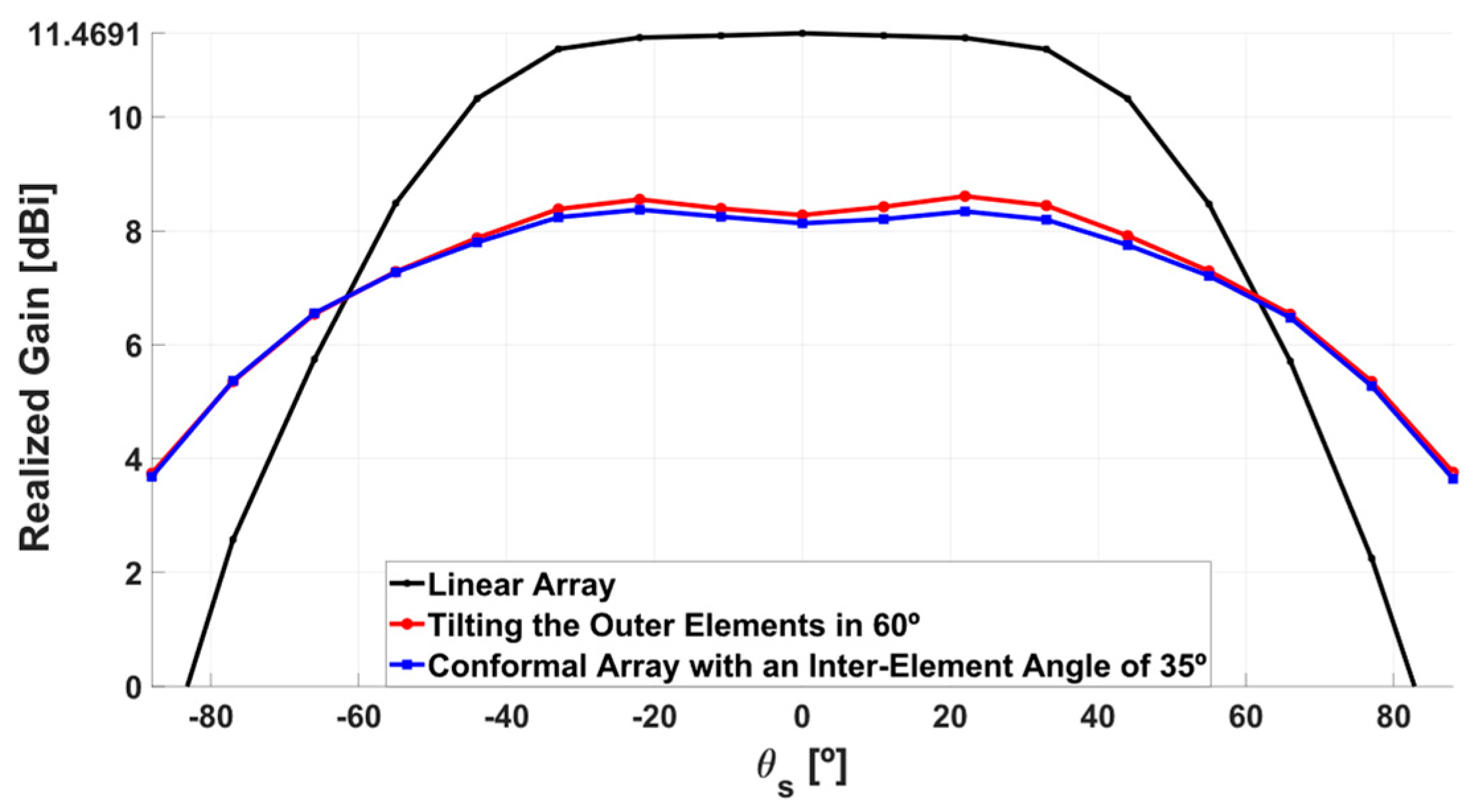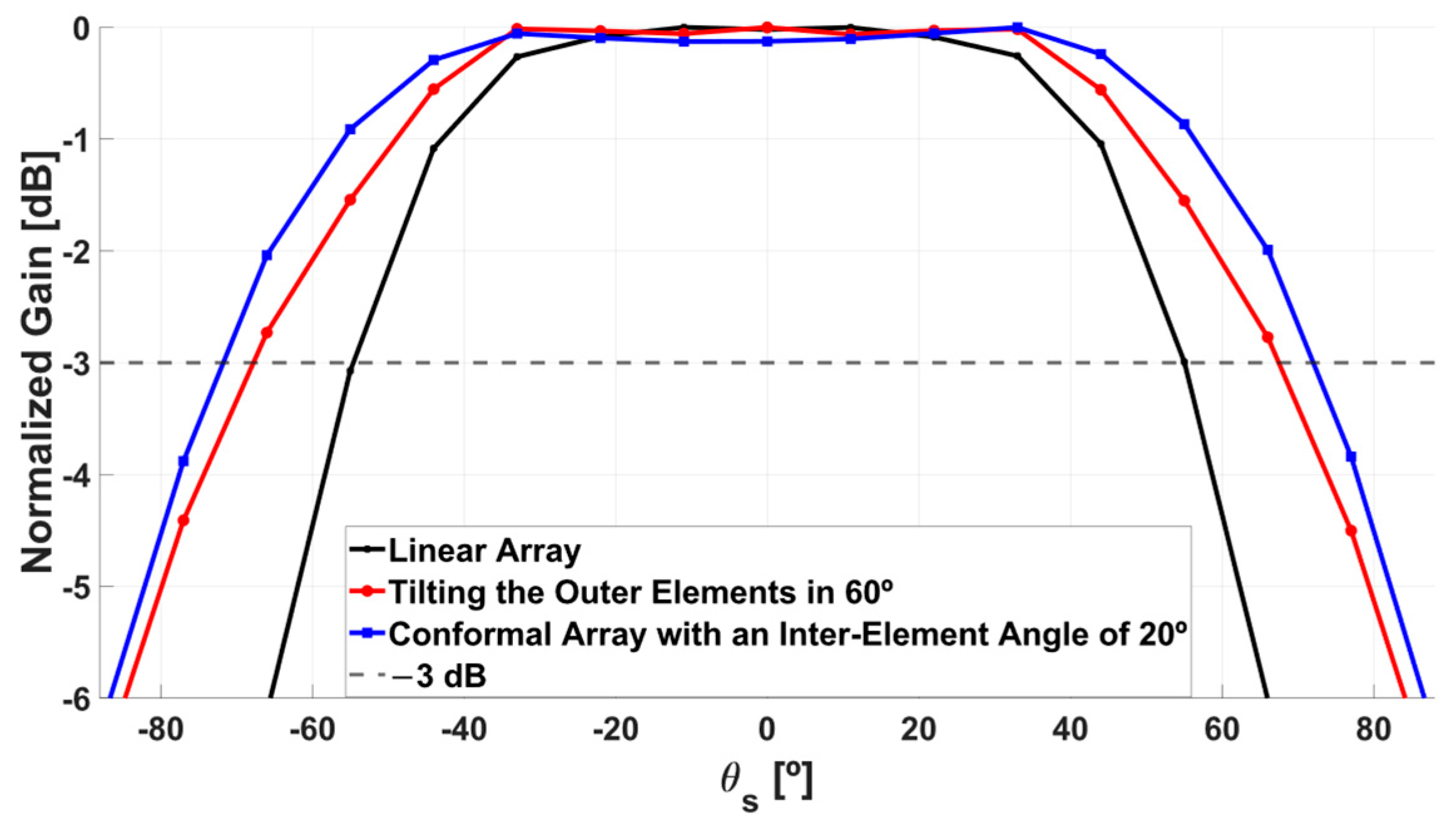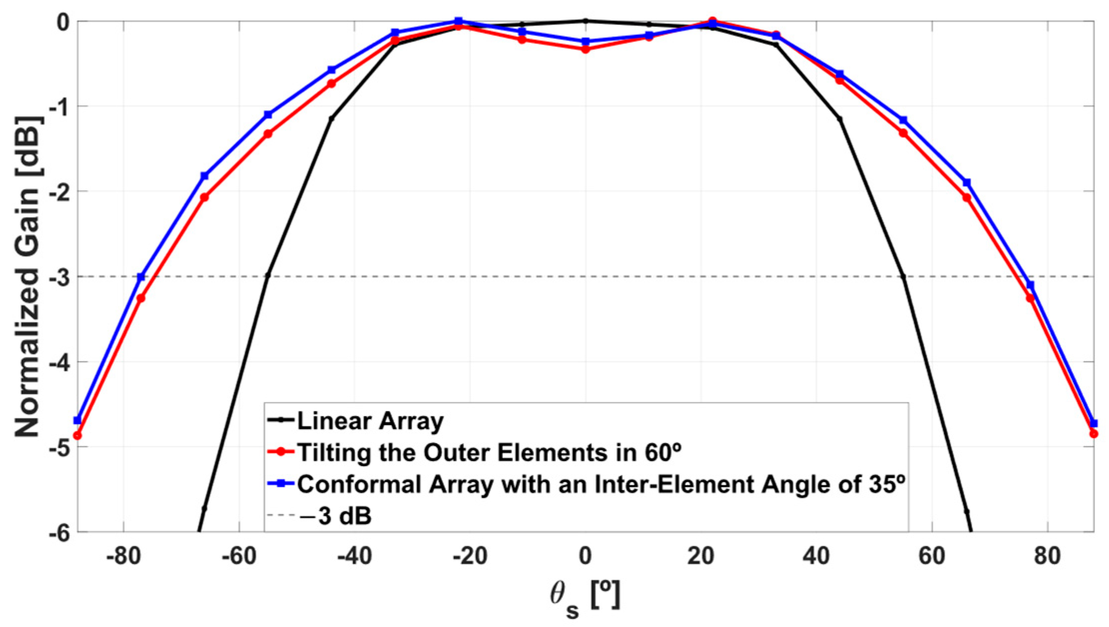 Figure 11, it can be seen that, for a reduction in broadside gain of approximately 50% (44% and 53%), these configurations provide a significant improvement in angular beam coverage: about 35.5% for the tilted-outer-elements array and 39.1% for the arc-shaped configuration, compared to the reference linear array.