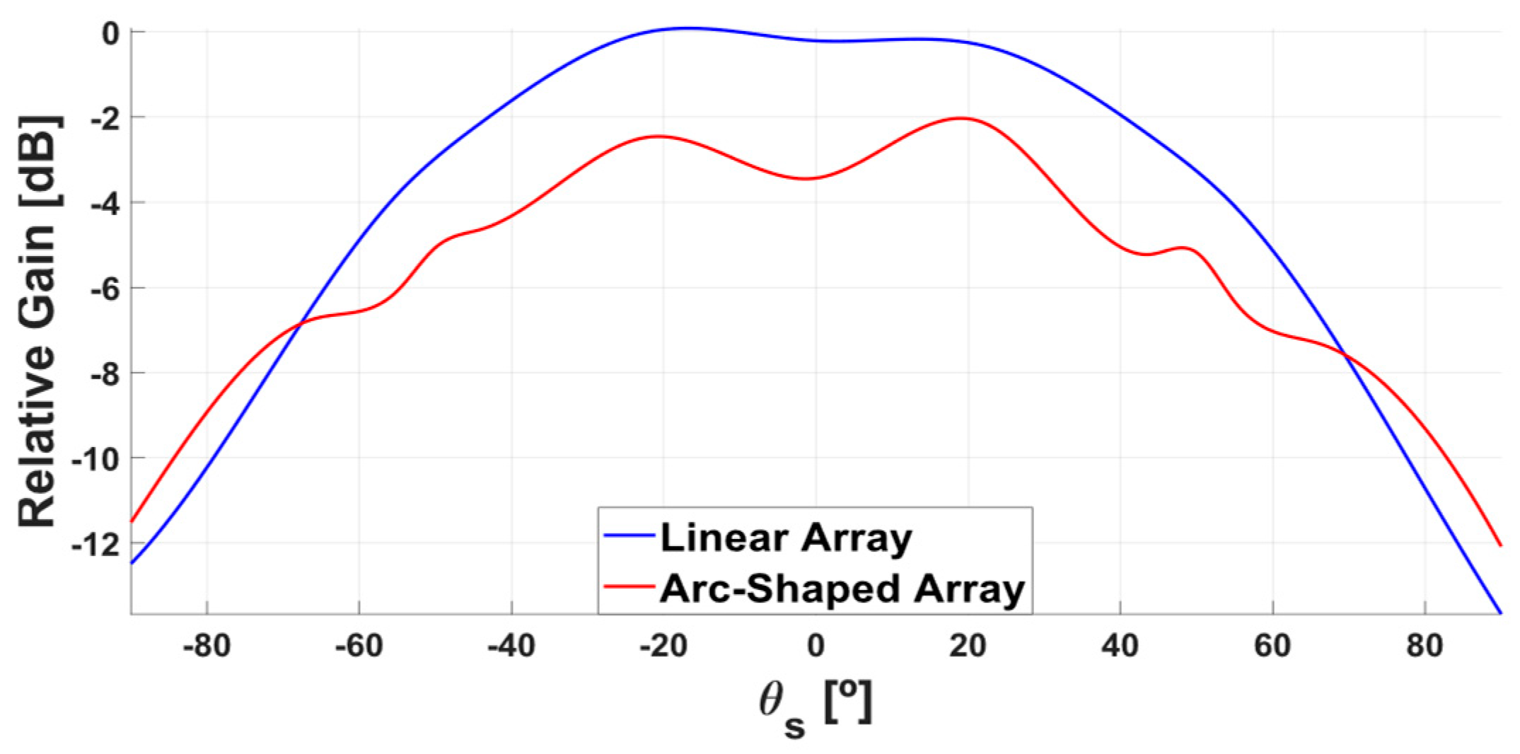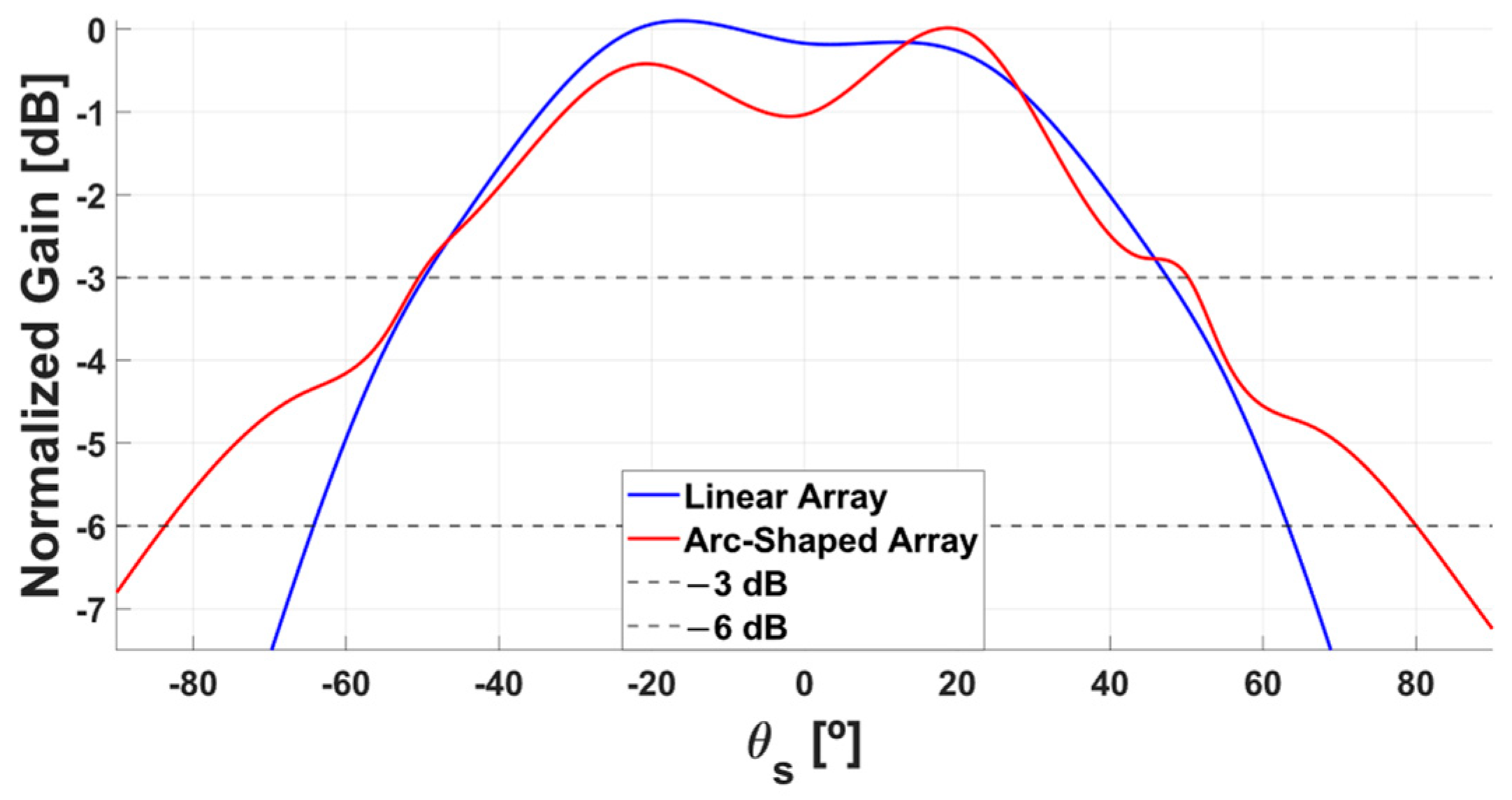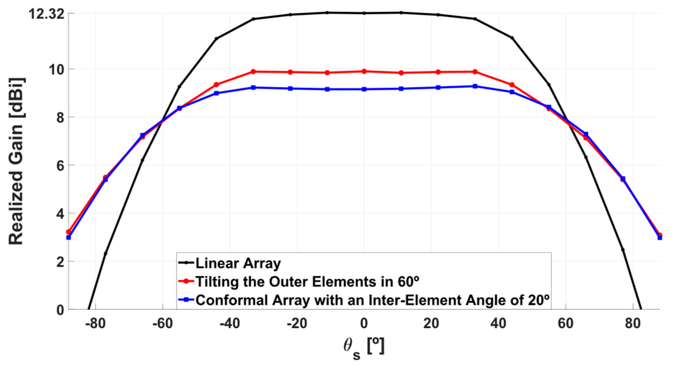 Figure 11, it can be seen that, for a reduction in broadside gain of approximately 50% (44% and 53%), these configurations provide a significant improvement in angular beam coverage: about 35.5% for the tilted-outer-elements array and 39.1% for the arc-shaped configuration, compared to the reference linear array.