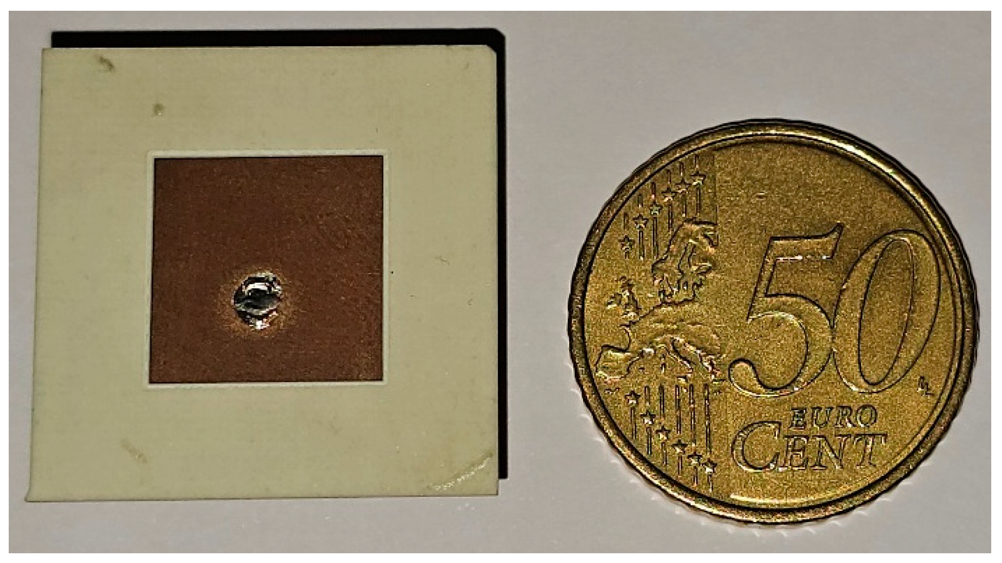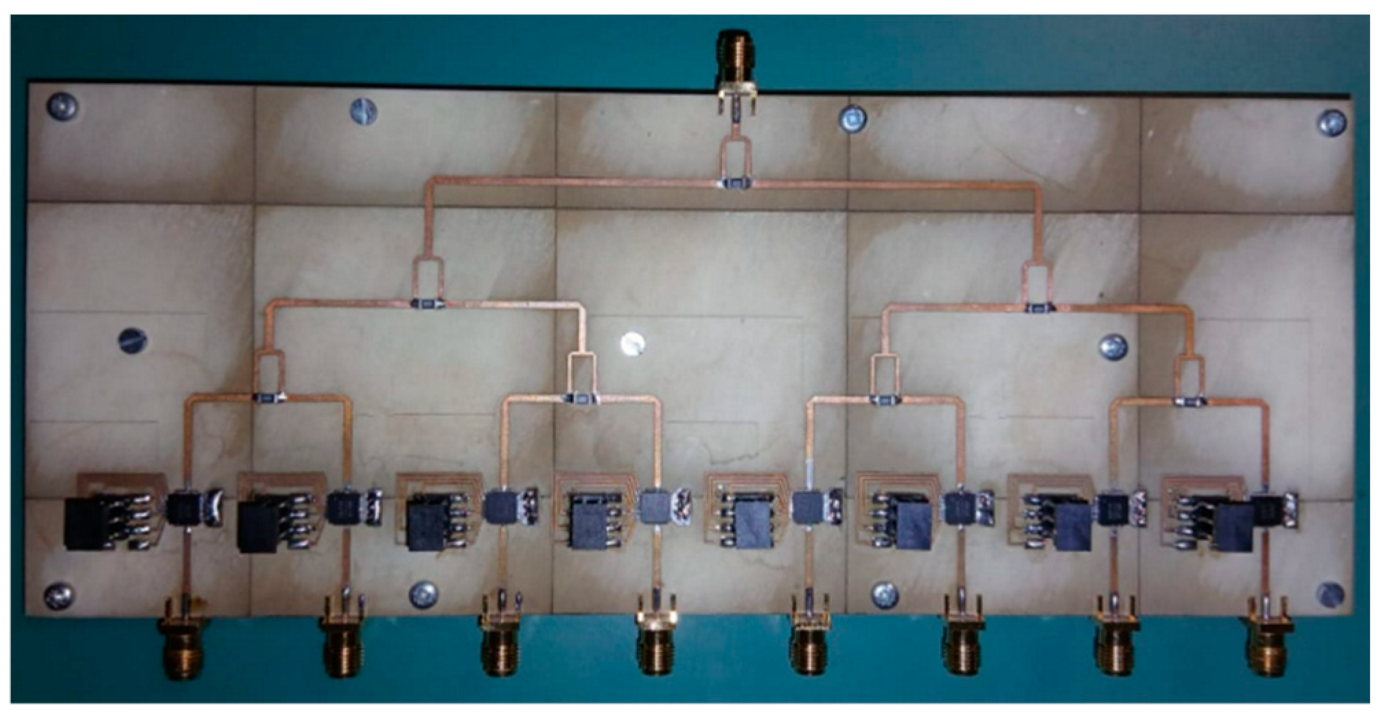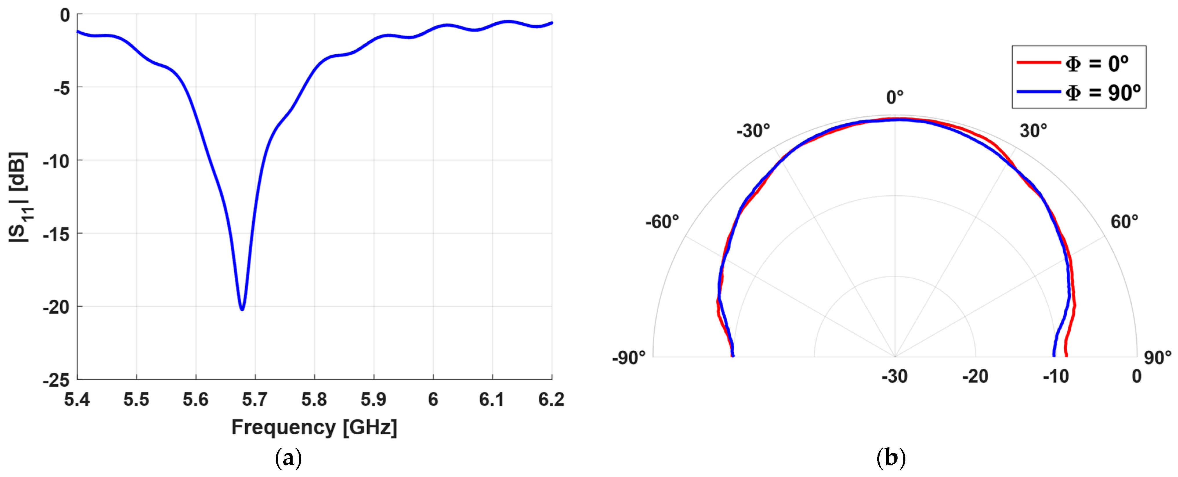 The radiating element used in the arrays is a square microstrip patch antenna with coaxial back feeding, designed to operate at 5.8 GHz, implemented on a Rogers RO4350B substrate with relative permittivity of εr = 3.66 and thickness h = 0.76 mm. The patch has dimensions of 12.96 × 12.96 mm2, and the ground plane measures λ/2, presenting a realized gain of 6.41 dBi and a half-power beamwidth (HPBW) of 89° and an angular beamwidth of approximately 205° at the −6 dB level. In terms of efficiency, the element achieves about 94%.