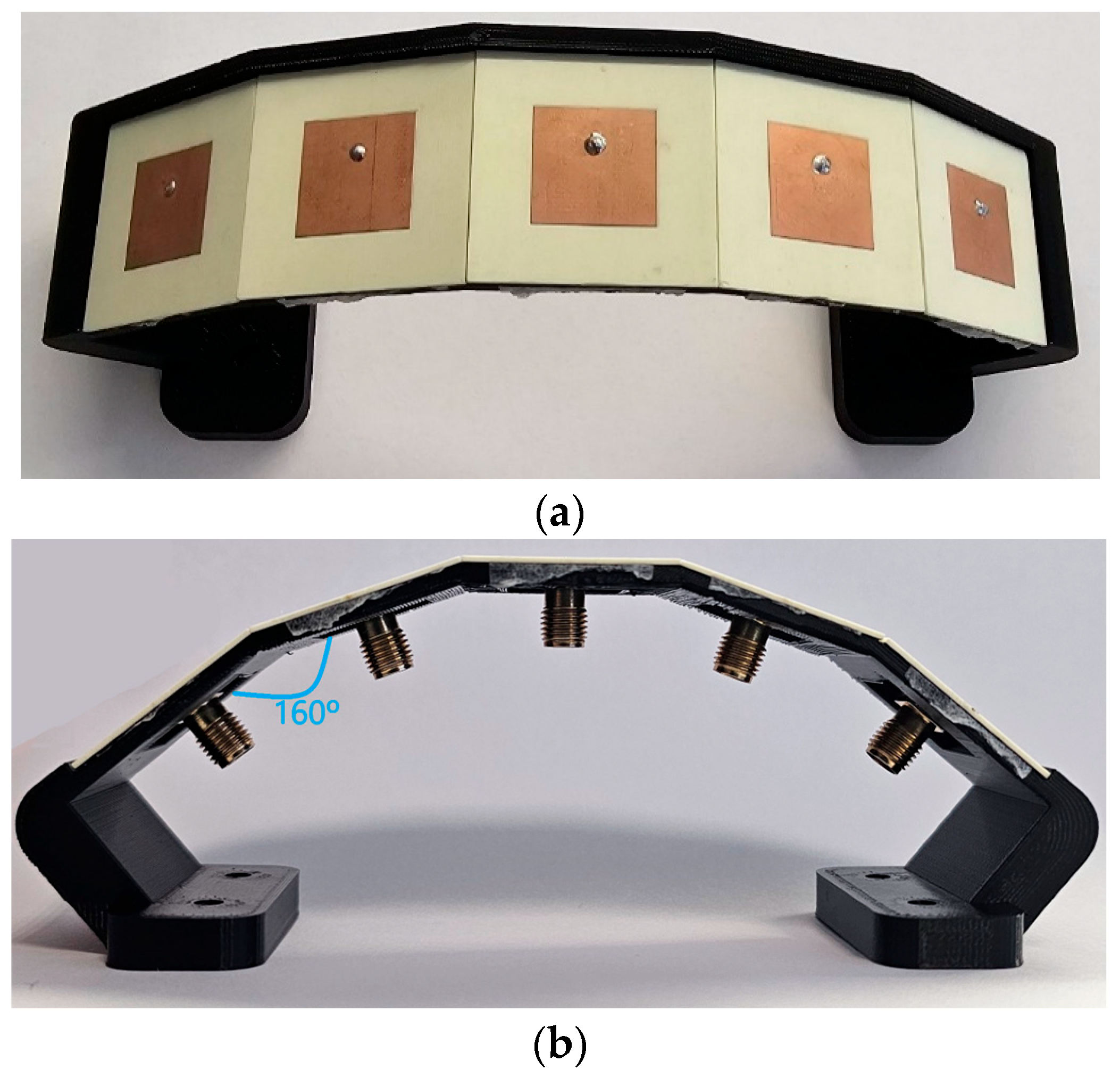 The five-element arc-shaped array was selected for prototyping to experimentally assess the practical feasibility of the conformal configuration, as it provides a suitable trade-off between coverage improvement and implementation complexity. Although the experimental results did not fully reproduce the simulated performance due to practical constraints, such as fabrication tolerances, phase quantization, and assembly inaccuracies, they qualitatively confirmed the expected behavior associated with curvature, demonstrating a consistent increase in angular coverage.