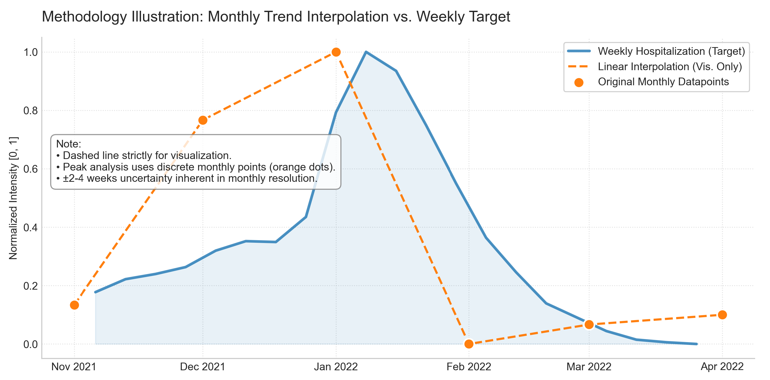 Figure 2, dashed lines denote linear interpolation used for visualization only; all peak-timing statements are based on the original monthly datapoints.