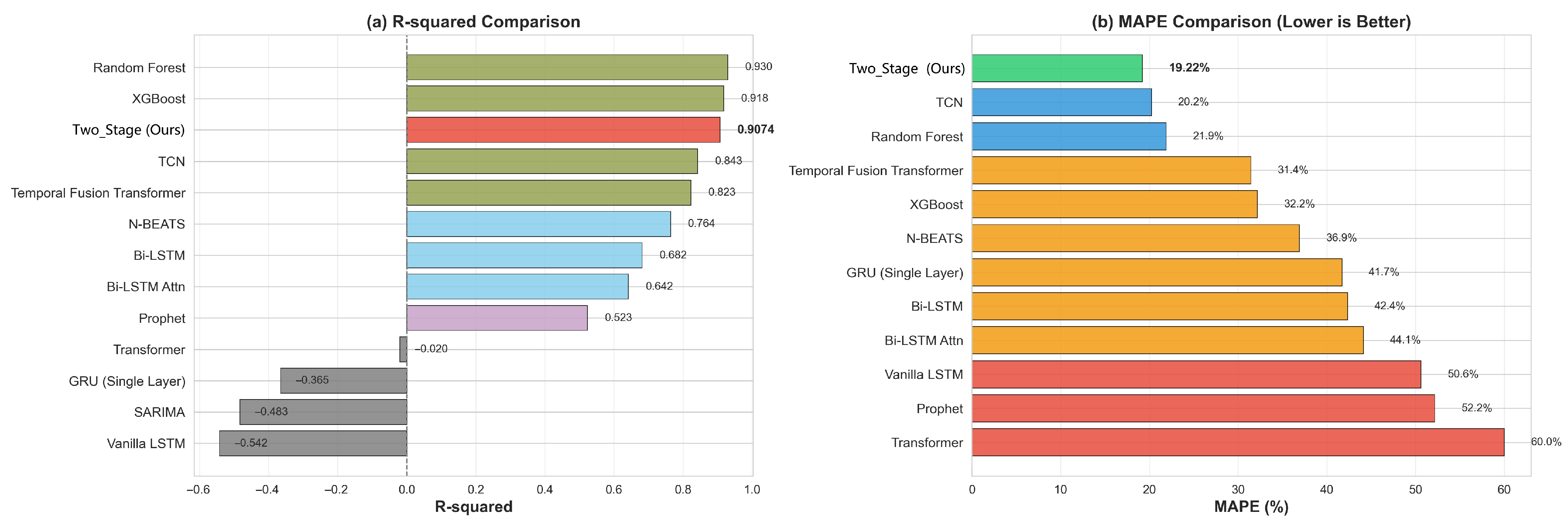 2 = 0.907 and reducing MAPE to 19.22%. Notably, the strongest single-stage baseline is TCN (