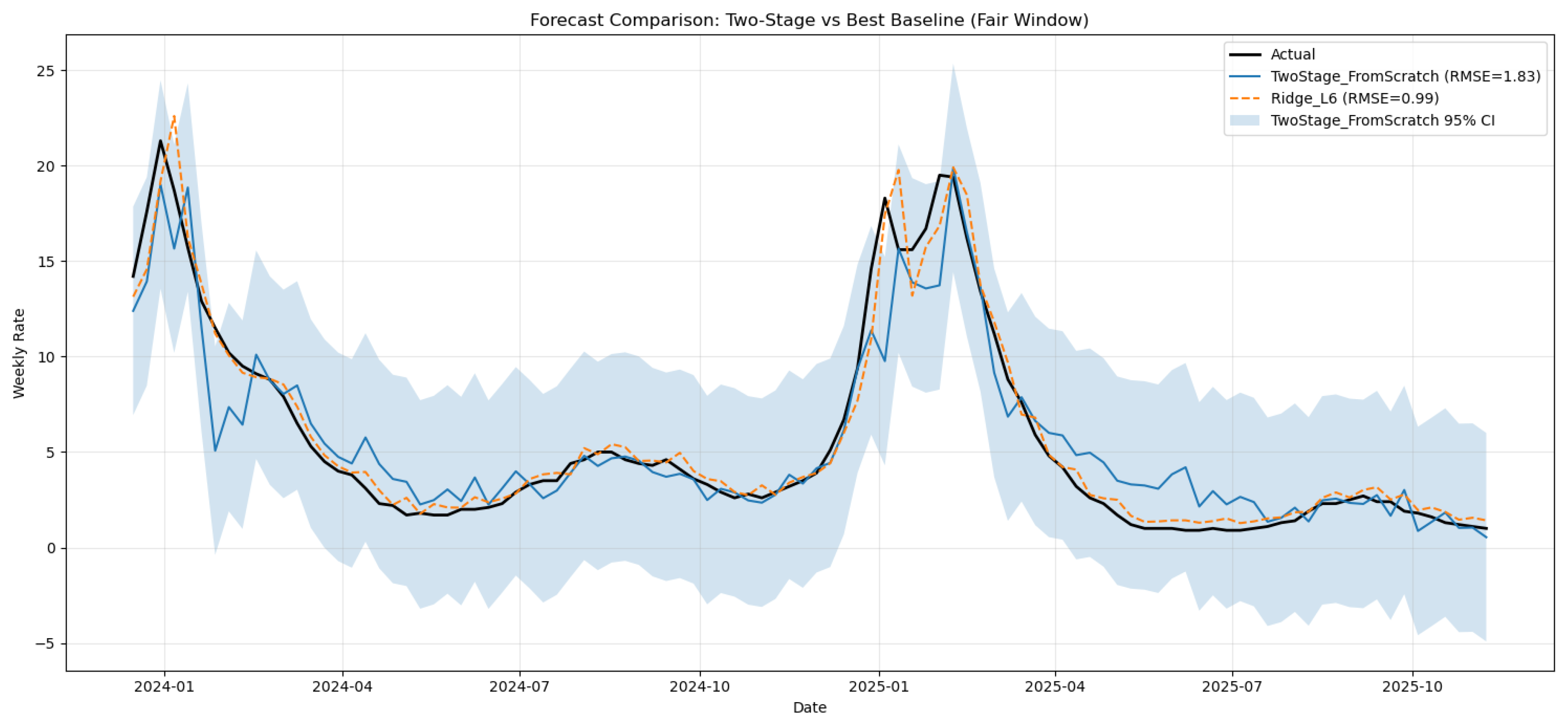 Table 3. On this particular test window, a simple autoregressive baseline (Ridge_L6) achieves the best one-step-ahead point accuracy, indicating that short-lag autoregression is highly competitive when the recent history is strongly predictive. In contrast, our two-stage model prioritizes a structured baseline–excess decomposition and provides calibrated uncertainty estimates via conformal prediction. As shown in