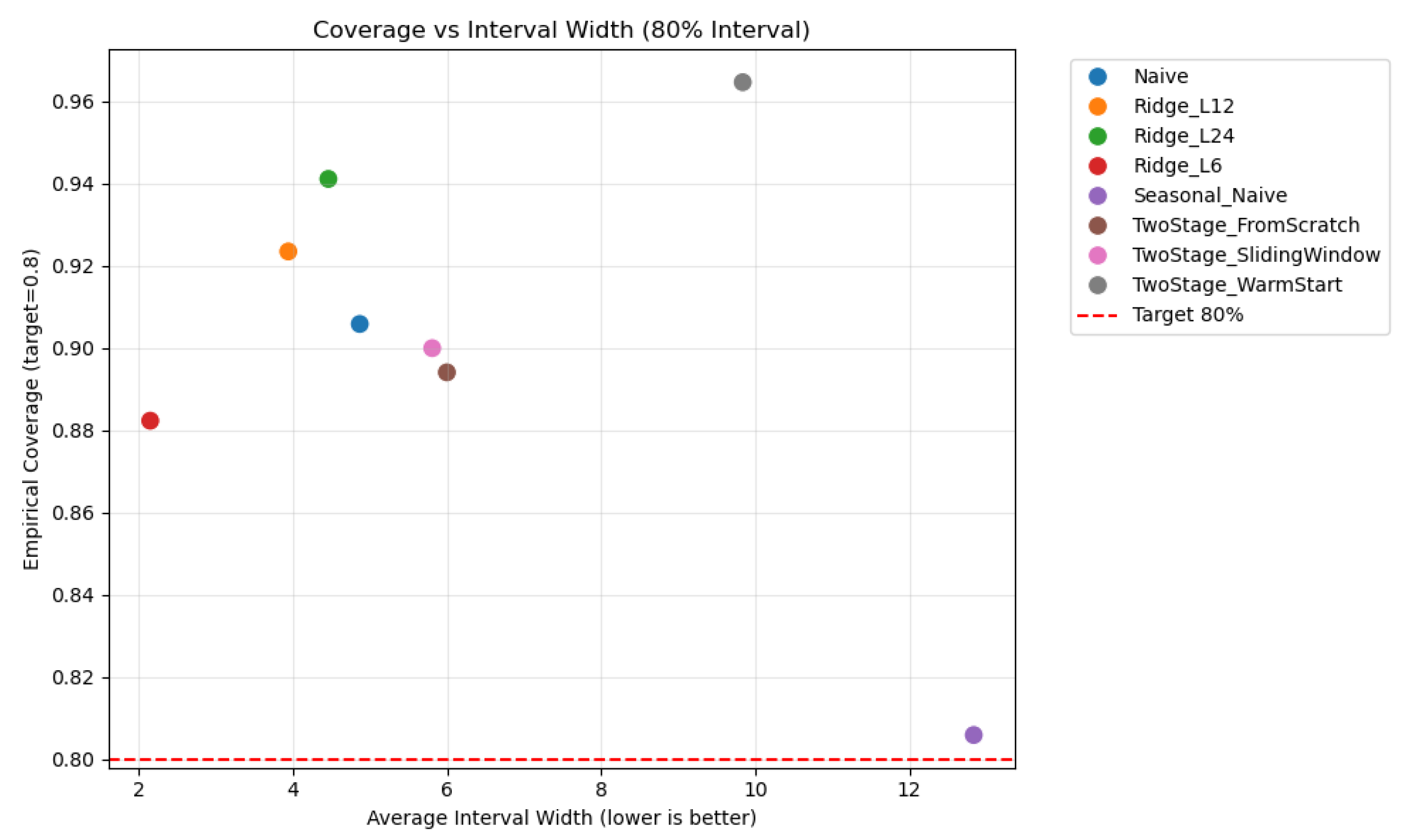Figure 5 further visualizes the coverage–width trade-off for the 80% prediction interval under the same rolling-window setting on AME. Specifically, it compares empirical coverage against average interval width, thereby showing how uncertainty calibration complements point accuracy in deployment-oriented evaluation. The figure indicates that different models balance calibration and sharpness differently, providing an additional probabilistic perspective beyond point-forecast error alone.
