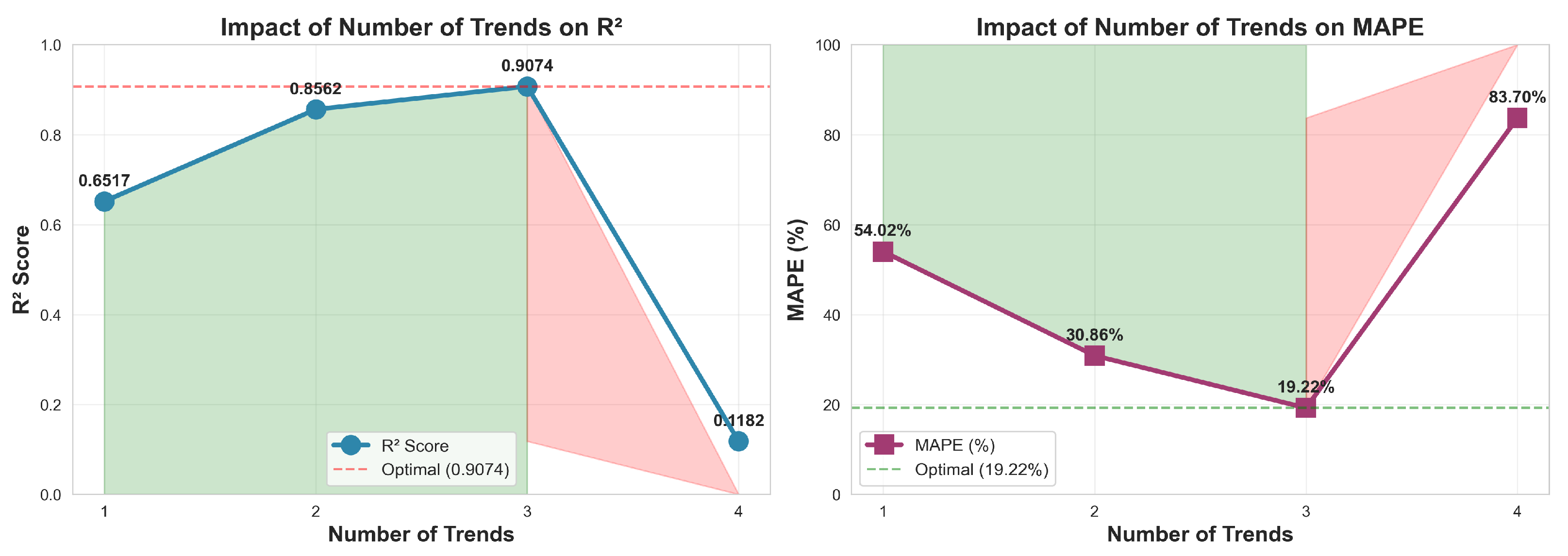 Figure 7 show a clear “sweet spot”: incorporating three trends yields the best generalization, while adding a fourth trend leads to severe overfitting (