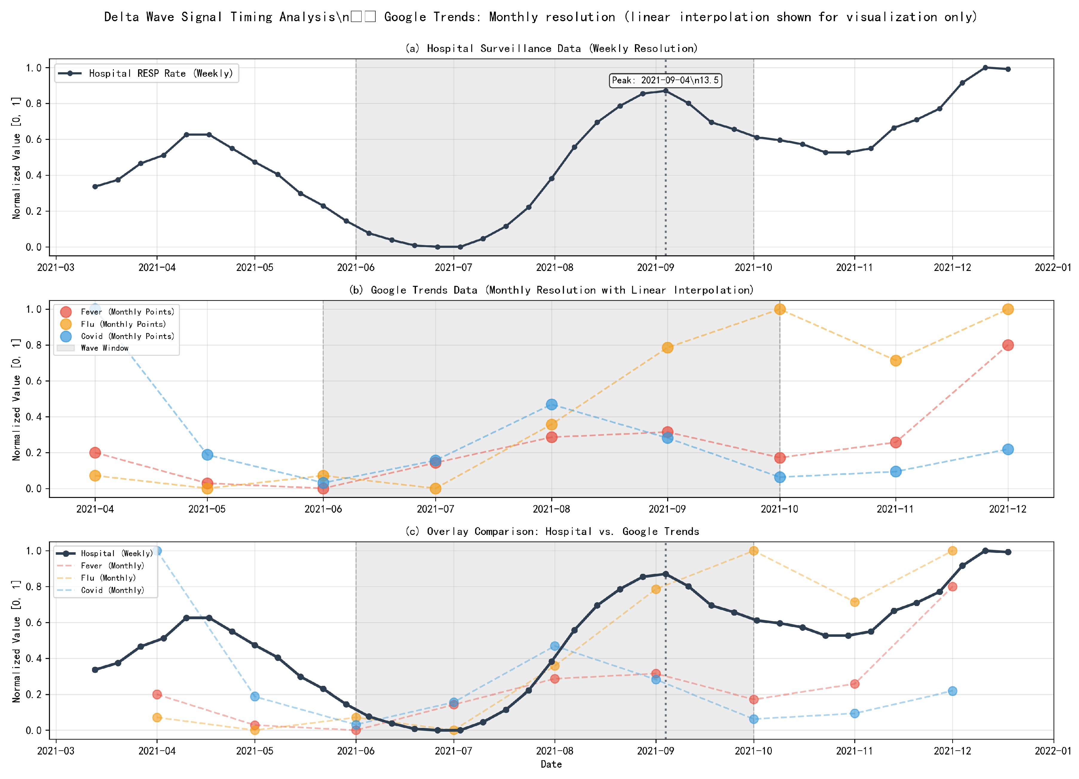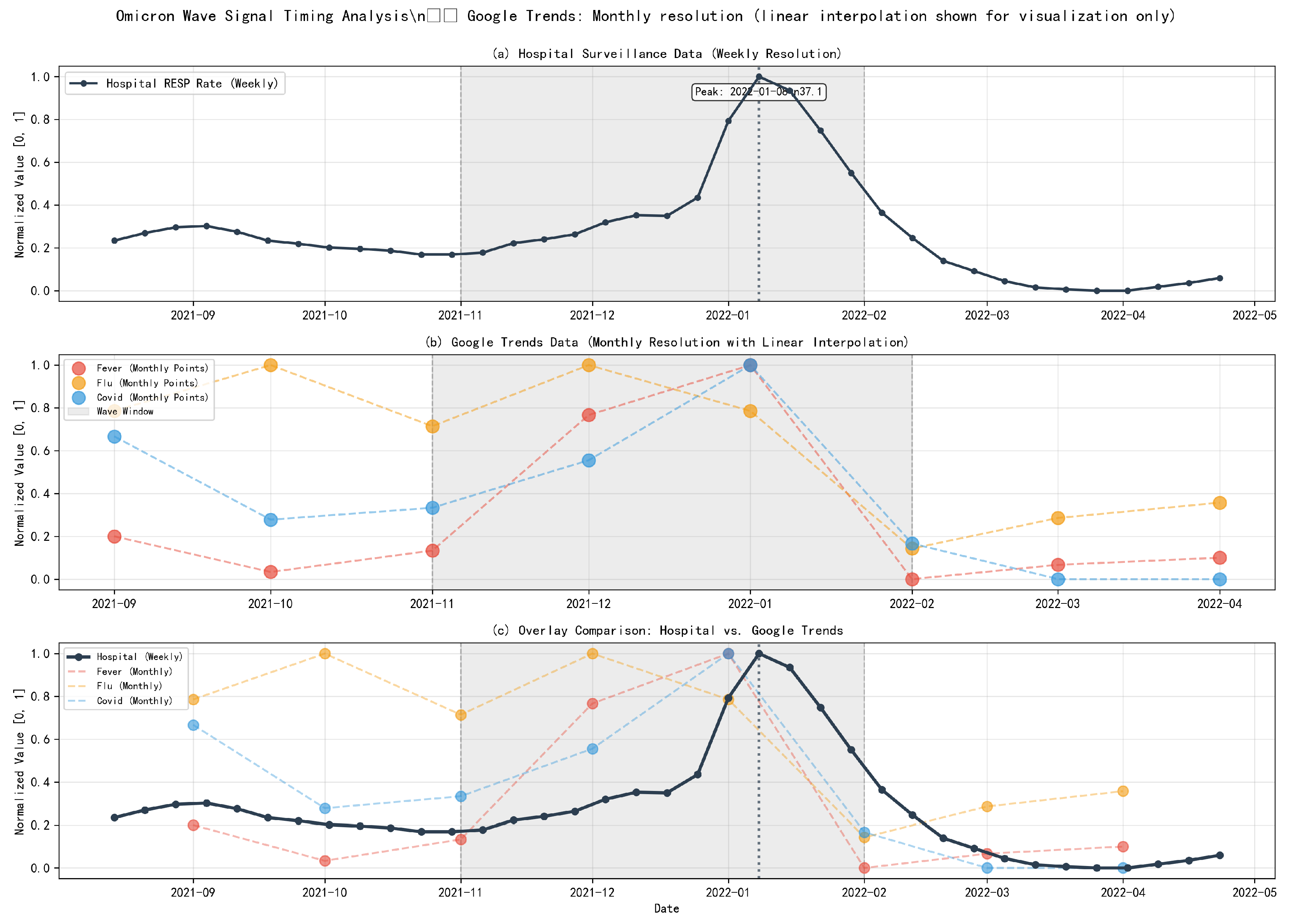 Figure 9 (Omicron) compare weekly hospital RESP rates against monthly Google Trends signals. During the Delta wave, the hospital peak occurs on 4 September 2021, while fever searches peak on 1 September 2021 (approximately contemporaneous at monthly resolution). COVID-19 searches peak around 1 August 2021 (about one month earlier), whereas flu searches peak around 1 October 2021 (about one month later). During the Omicron wave, the hospital peak occurs on 8 January 2022, while fever and COVID-19 searches peak around 1 January 2022 (approximately contemporaneous within ±2–4 weeks), and flu searches peak around 1 December 2021 (about one month earlier). Overall, the figures suggest that search behavior broadly co-moves with hospital dynamics at the wave scale, but because the Google Trends signals are only available retrospectively at monthly resolution, these comparisons should be interpreted as qualitative evidence rather than as strong week-scale early-warning claims. We further summarize the peak timing differences between hospital RESP data and Google Trends in