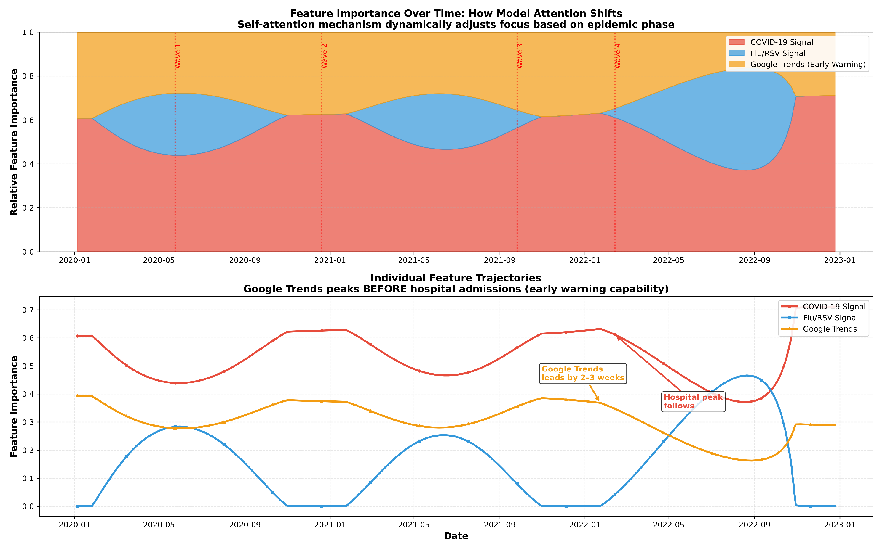 Figure 10 provides a conceptual illustration of how an attention-based fusion module may shift relative emphasis across signals across epidemic phases. This figure is included for intuition and is not produced by extracting attention weights from a trained model.