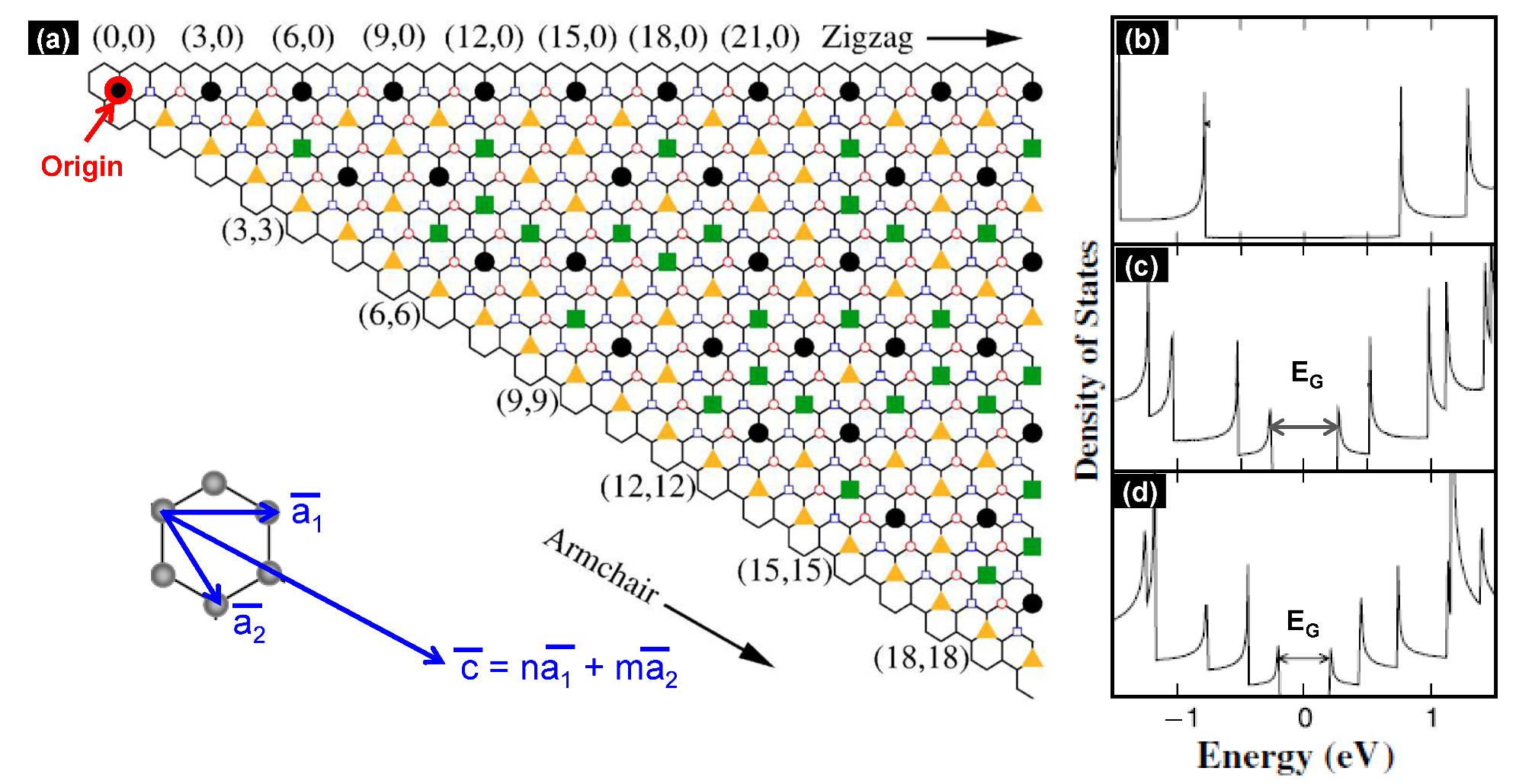 Single-Walled Carbon NanoTubes (SWCNTs) were first discovered in 1991 [1] and their electronic properties depend on the directions at which two-dimensional graphene stripes are (hypothetically) rolled to make SWCNTs [2,3,4]. When a SWCNT is defined by rolling a graphene layer and by joining any of the solid symbols of Figure 1a with the lattice origin (a1,a2) = (0,0), resultant SWCNT will have metallic properties with no bandgap in the energy vs. density of the state’s relationship (Figure 1b). On the other hand, SWCNTs defined by joining the open symbols of Figure 1a with the lattice origin will have semiconducting properties with bandgaps (Figure 1c,d) that can be expressed as [2,3]: