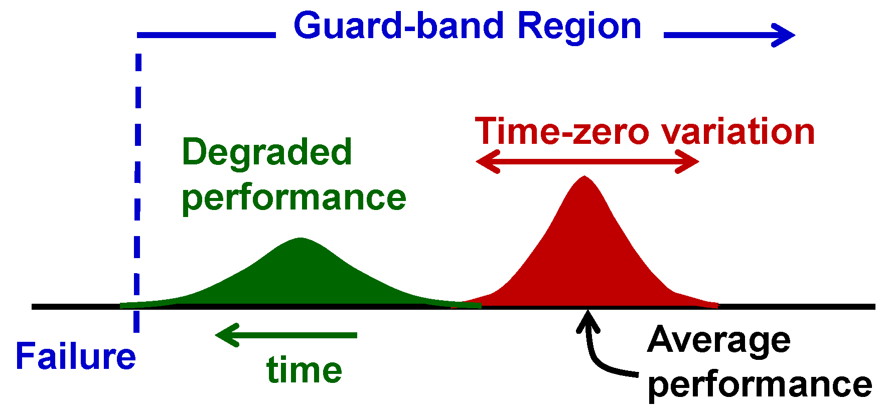 Schematic representation of the amount of guard-band that is used in electronics for handling process (or time-zero) variation and reliability (time dependent variation) in device performance. The performance of a device has a distribution over and above its mean value and it degrades over time. Once of the tail of performance distribution for the device reaches the guard-band margin, the associated device is designed to fail.