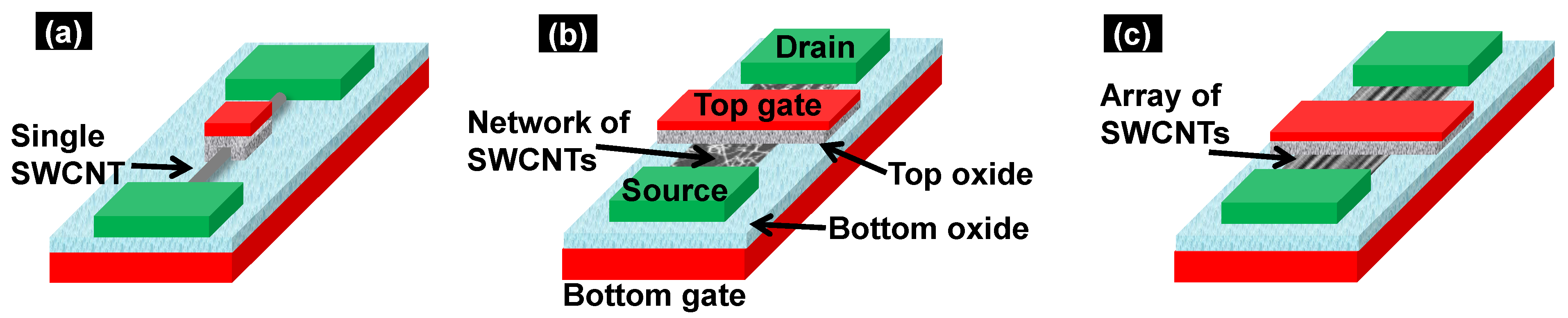 - Ho, X.; Ye, L.; Rotkin, S.V.; Cao, Q.; Unarunotai, S.; Salamat, S.; Alam, M.A.; Rogers, J.A. Scaling properties in transistors that use aligned arrays of single-walled carbon nanotubes. Nano Lett. 2010, 10, 499–503. [Google Scholar] [CrossRef]