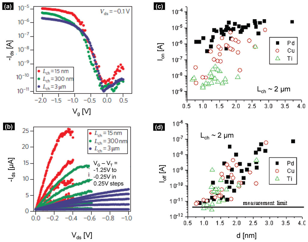 (a) Transfer or Ids-Vg and (b) output or Ids-Vds characteristics of single s-SWCNT-FETs (reprinted by permission from Macmillan Publishers Ltd: Nature Nanotechnology [63], © 2010). Diameter dependence of (c) on-current Ion and (d) off-current Ioff for s-SWCNT-FETs using different types of metals (palladium: Pd, copper: Cu, titanium: Ti) as source/drain (reprinted with permission from Ref. [58], © 2006 American Chemical Society.). In general, easier hole conduction for higher work-function (ΦWF) contact metals like Pd results higher Ion and Ioff for associated FETs.