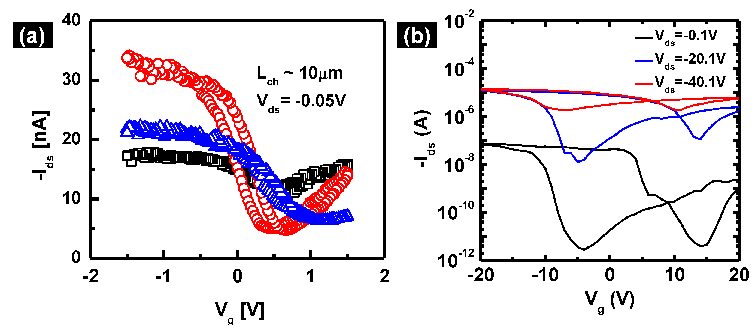 In contrary to s-SWNTs, FETs with single metallic (m-) SWCNT-FETs have very small gate modulation and show ambipolar behavior with a smaller n-type tail (Figure 5a). Such gate modulation is often attributed to the presence of Mott-insulating states [68] and/or strain-induced bandgap [69] in m-SWCNTs. FETs with s-SWCNTs also show ambipolar behavior, more significantly at higher |VDS| and for larger diameter s-SWCNTs (Figure 5b) due to band-to-band tunneling (BTBT) [70].