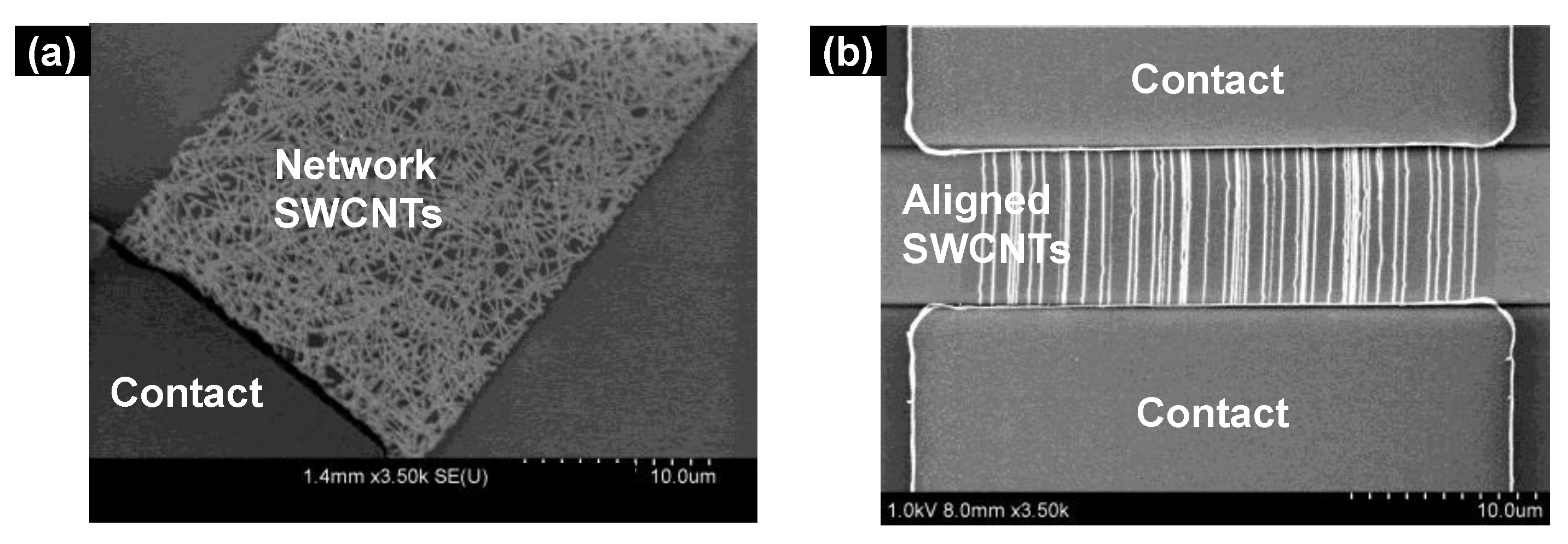 Network SWCNTs have impedances at the junctions of different SWCNTs; consequently, they have lower conductance and are suitable only for applications like non-volatile memories [14,15]. Parallel arrangement of aligned SWCNTs resolves the issue with junction impedance and promises applications of SWCNTs in high performance radio frequency (RF) electronics [47,71,72], and transparent electronics [73,74]. Figure 6b shows a SEM image of one such top-gated FET before gate dielectric and gate metal formation. These aligned array SWCNT-FETs are either fabricated by growing SWCNTs via CVD on special types of quartz or sapphire substrates, whose crystal orientations [49] and/or step-edges [75,76] help parallel alignment (with less than 0.1% imperfection [77]) of d ~ 0.7~3 nm SWCNTs [26,44,45], or fabricated by aligning solution-processed SWCNTs via dielectrophoresis [46]. CVD-grown SWCNTs are long (with a length of several hundreds of µm [77]) and have high conductivity [5,25,63,67], however, require the use of post-processing techniques like thermo-lithography [54] and laser irradiation [78] for removal of m-SWNTs, or electrical breakdown [79] for breaking the continuity of m-SWNTs, and hence, cause FETs to use the remaining s-SWNTs.