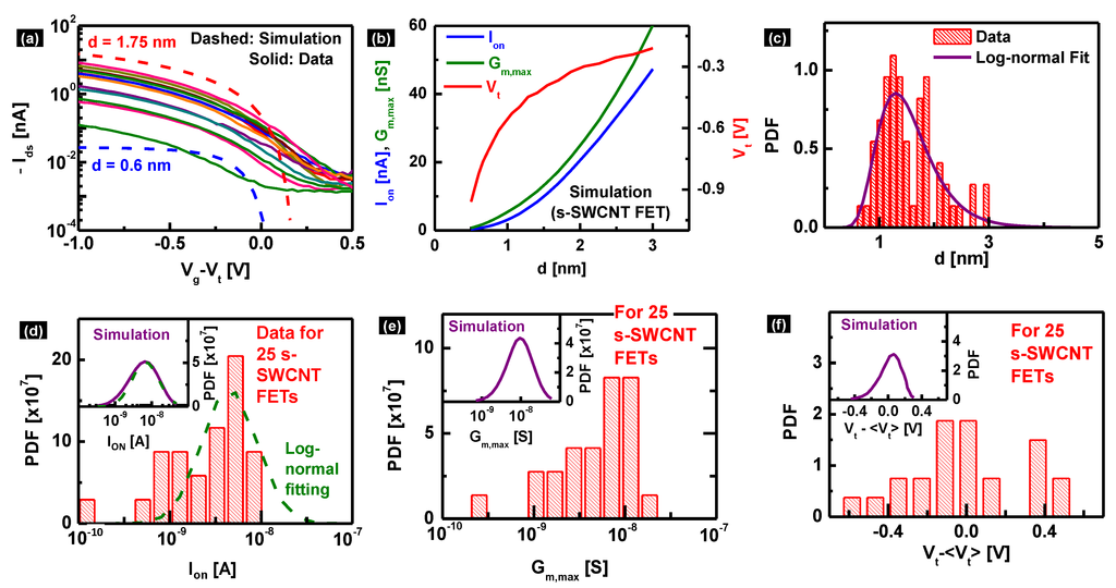 and hence, calculate Ids using Ids = Gds × Vds. Simulated results for 0.6 nm < d < 1.75 nm are consistent with measurement at Vg < Vt, where Gss dominates Gds. The differences in the region of Vg > Vt, where Gc dominates Gds, partly reflect variation in the fixed component of Gc [80] that is not considered in simulation and also reflect Ids measurement limitation set at ~pA. Plots of diameter dependence of Ion (≡Ids @ Vg − Vt = −1V, Vds = 50 mV), maximum transconductance Gm,max (≡max |∂Ids/∂Vg|), and Vt (Figure 7b) provide additional detail about the origin of performance variation in s-SWCNT FET. At large diameters, when the transmission of carriers through the Schottky barrier near the contacts is unity, variation of Ion ~ d and Gm,max ~ d2 originates from the diameter dependence of μeff in s-SWNTs [5,81,82]. Similarly, variation of Vt (≡Vg @ |Ids| = |Ids,max|/100) with d follows that of Ion. At small diameters, non-linear dependence of transmission through the contact Schottky barrier leads to a non-linear variation in Ion, Gm,max, and Vt with d.