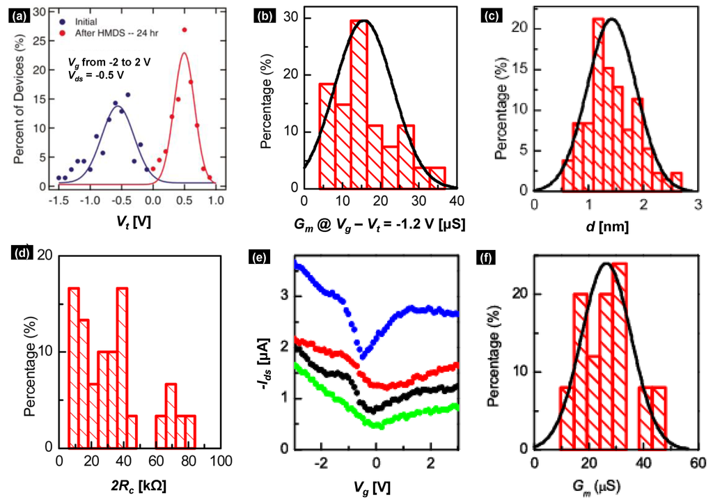 (a) Treatment of hexamethyldisilazane (HMDS) for 24 h narrows the Vt distribution significantly. Vg was swept from −2 V to 2 V for p-type, solution-processed s-SWCNT FETs during this measurement. Measured (b) Gm distribution and (c) diameter distribution for similar solution-processed, s-SWCNT FETs that has small channel length (Lch = 150 nm). (d) Extracted contact resistance (Rc) distribution for Lch = 150 nm, solution-processed s-SWCNT FETs. (e) Transfer characteristics and (f) Gm distribution for solution-processed, m-SWCNT FETs. (a–c) and (d–f) are reprinted with permission from Refs. [28] and [86], respectively; © 2012 American Chemical Society.