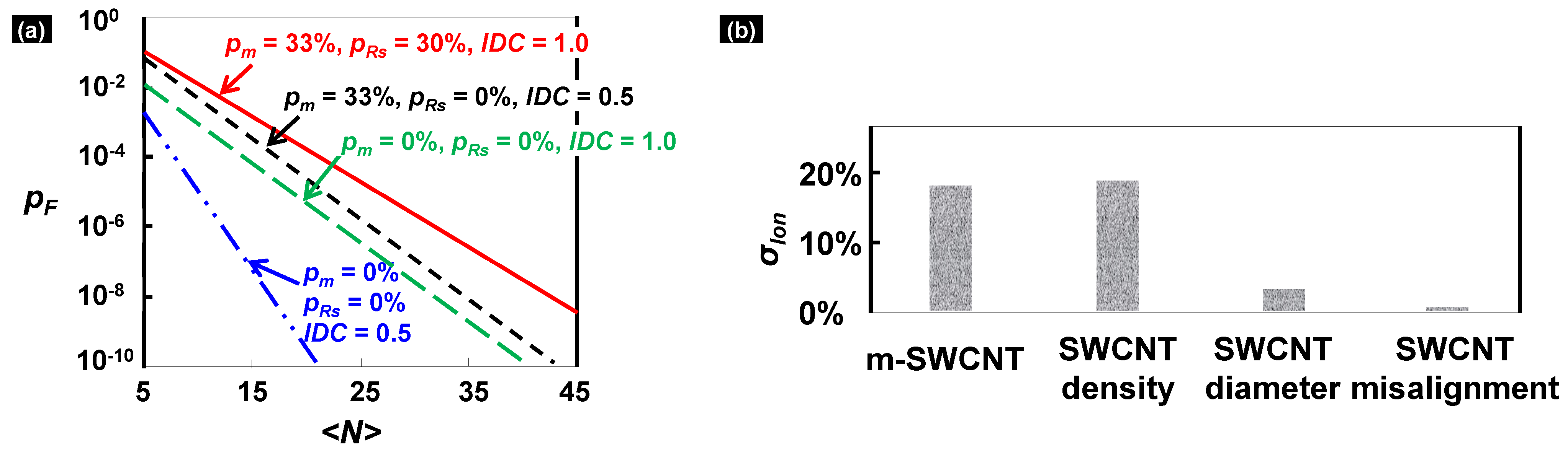 (a) Variation in failure probability (pF; defined as probability of having no s-SWCNT within the FET) of m-SWCNT removed (via post-processing) aligned-array SWCNT-FETs with <N> (defined as the average number of SWCNTs within the FET before post-processing). Simulation is performed for different values of pm (defined as the probability of having m-SWCNT within the FET before post-processing), pRs (defined as the probability of s-SWCNT removal via post-processing), and IDC (index of dispersion in SWCNT count). (b) Different variation sources like the presence of m-SWCNT before post-processing, SWCNTs’ density, diameter, and misalignment contributes differently to the overall variation in standard deviation of Ion (σIon). Simulation suggests that the presence of m-SWCNT and density distribution are the key variability sources in SWCNT FETs. These figures are plotted using data from Ref. [91].
