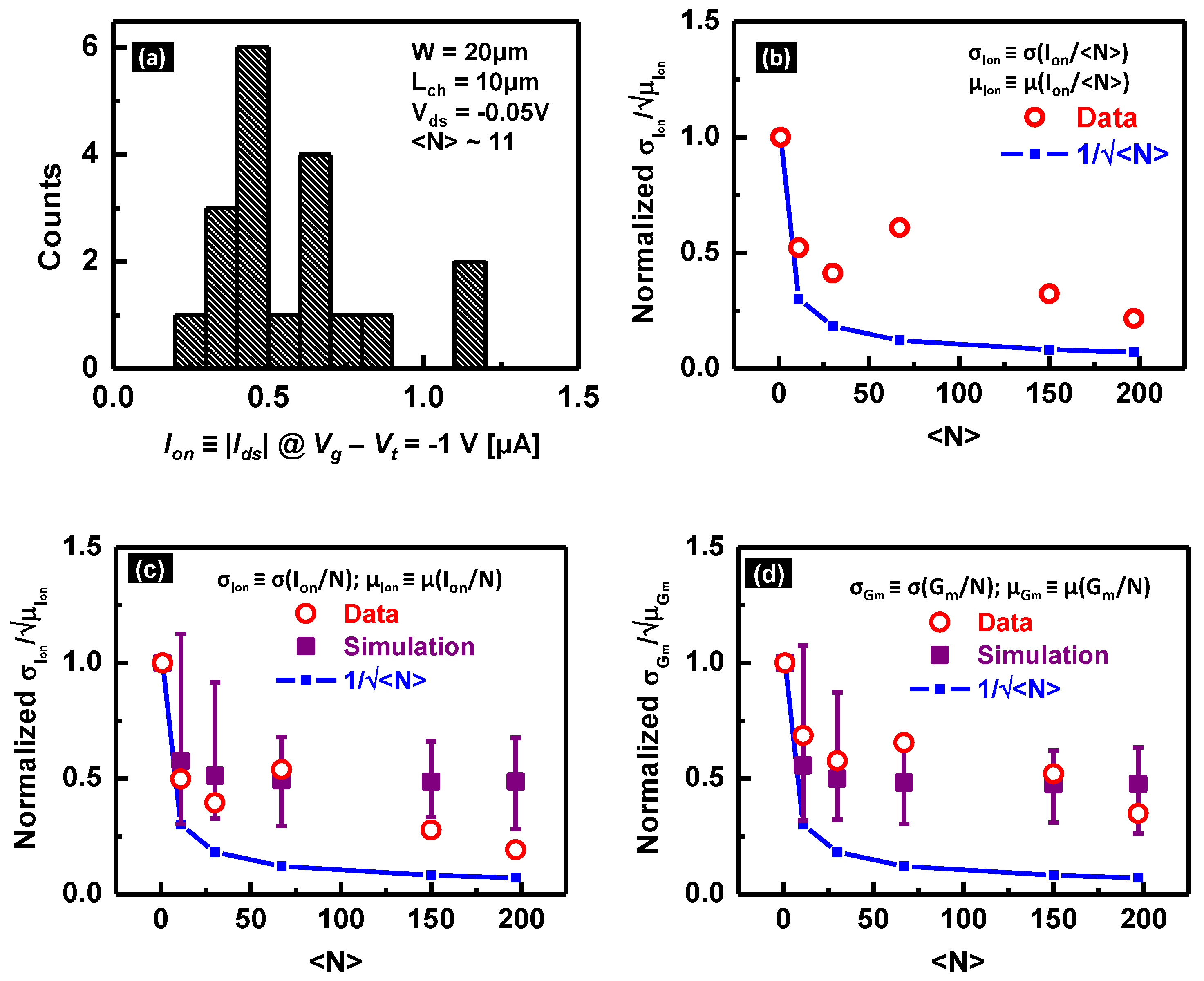 (a) Distribution of Ion among array-SWCNT FETs with mean SWCNT density <N> ~ 11. (b) Normalized standard deviation of Ion (σIon) vs. <N> deviates from 1/√<N> scaling or central limit theorem. Normalized (c) σIon and (d) σGm for array-SWCNT FETs, where the effect of SWCNT density variation is removed by counting N for each FET and then calculating the standard deviations using Ids/N–Vg characteristics of each FET. Variations in σIon and σGm still differs from 1/√<N> and required the consideration of wafer-scale diameter distribution for matching experimental trends via detailed simulation. Figures are reprinted with permission from Ref. [44]; © 2012, AIP Publishing LLC.