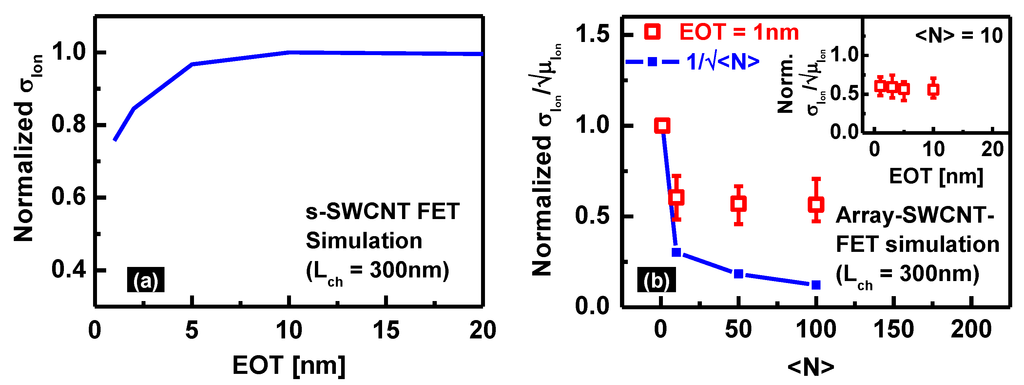 (a) Oxide scaling of s-SWCNT FET reduces σIon (normalized by its value at equivalent oxide thickness (EOT = 20nm), as observed in Ref. [93]. (b) Normalized σIon (i.e., σIon/σIon,<N>=1) differs from 1/√<N> scaling for EOT = 1 nm array-SWNT FETs and show negligible effect of oxide scaling at fixed <N> (inset). Figures are reprinted with permission from Ref. [44]; © 2012, AIP Publishing LLC.