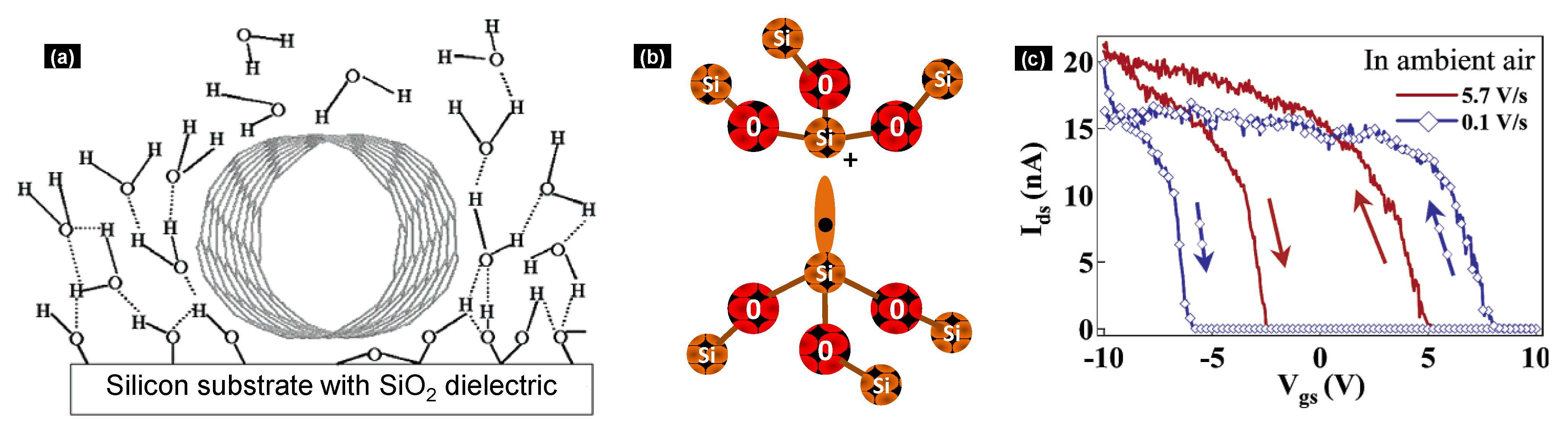 (a) Schematic representation of hydroxyl (–OH) group present at the surface of silicon dioxide on which SWCNTs are grown or placed. These –OH groups act as interface defect in SWCNT FETs. (b) Schematic representation of oxygen-vacancy related oxide defects [113] within silicon dioxide. (c) Transfer characteristics of s-SWCNT FET show large hysteresis between Vg sweeps performed in positive to negative and negative to positive directions. Measured hysteresis depends on sweep rate of Vg. (a,c) are reprinted with permission from Ref. [83]; © 2003 American Chemical Society.