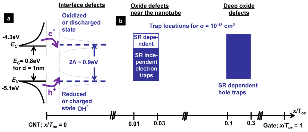 (a) Schematic representation of the Marcus-Gerischer theory [118] used to represent the dynamics of –OH group related interface defects to simulate hysteresis in a SWCNT FET with one d = 1 nm s-SWCNT [94]. EC, EV, EG are the conduction band, valence band, bandgap of the s-SWCNT, and Λ is the reorganization energy [105]. (b) Representative spatial and energy locations of near-interface electron traps (i.e., oxide defects that switch between negative and neutral charged states) and deep hole traps (i.e., oxide defects that switches between neutral and positive charged states) with σ ~ 10−13 cm2 [120] used for simulating oxide-defect related hysteresis in Ref. [94]; © 2012 WILEY-VCH Verlag GmbH & Co. KGaA, Weinheim.