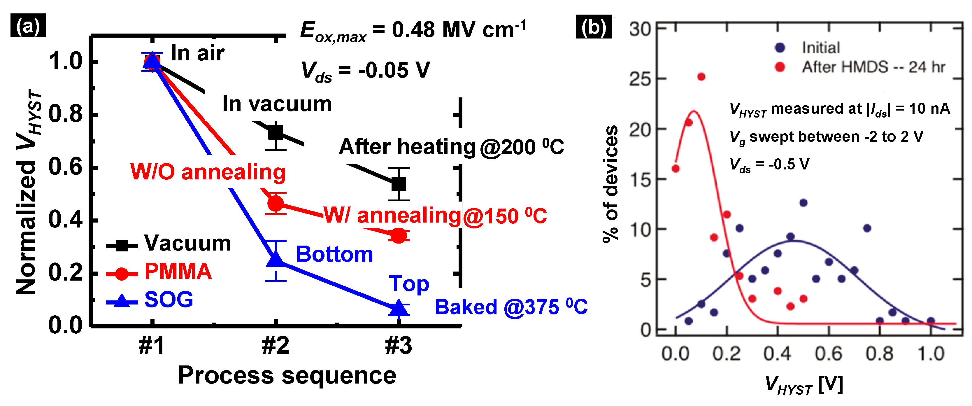 (a) Comparison of effectiveness of different hysteresis reduction techniques like heating in vacuum, use of poly-methyl methacrylate (PMMA) and SOG. Measured hysteresis (VHYST) in each case at similar Eox,max is normalized with that measured in air. For heating in vacuum, hysteresis is first measured in air at room temperature, then after 10 h in vacuum (10−5 Torr), and finally after 10 h of heating at 200 °C followed by cooling to room temperature in vacuum. For PMMA passivation (with: W/ and without: W/O), hysteresis is first measured in air before PMMA coating, then after PMMA coating and heating for 1min at 110 °C, and finally after an additional 15 h annealing at 150°C. For SOG encapsulation, hysteresis is first measured in air using a bottom-gated configuration, then after SOG encapsulation and 375 °C baking using bottom- and top-gated configurations. This figure is taken from Ref. [94]; © 2012 WILEY-VCH Verlag GmbH & Co. KGaA, Weinheim. (b) Use of hysteresis reduction technique like HMDS treatment before placing SWCNTs on oxides is also effective for narrowing distribution of measured hysteresis. This figure is reprinted with permission from Ref. [86]; © 2012 American Chemical Society.