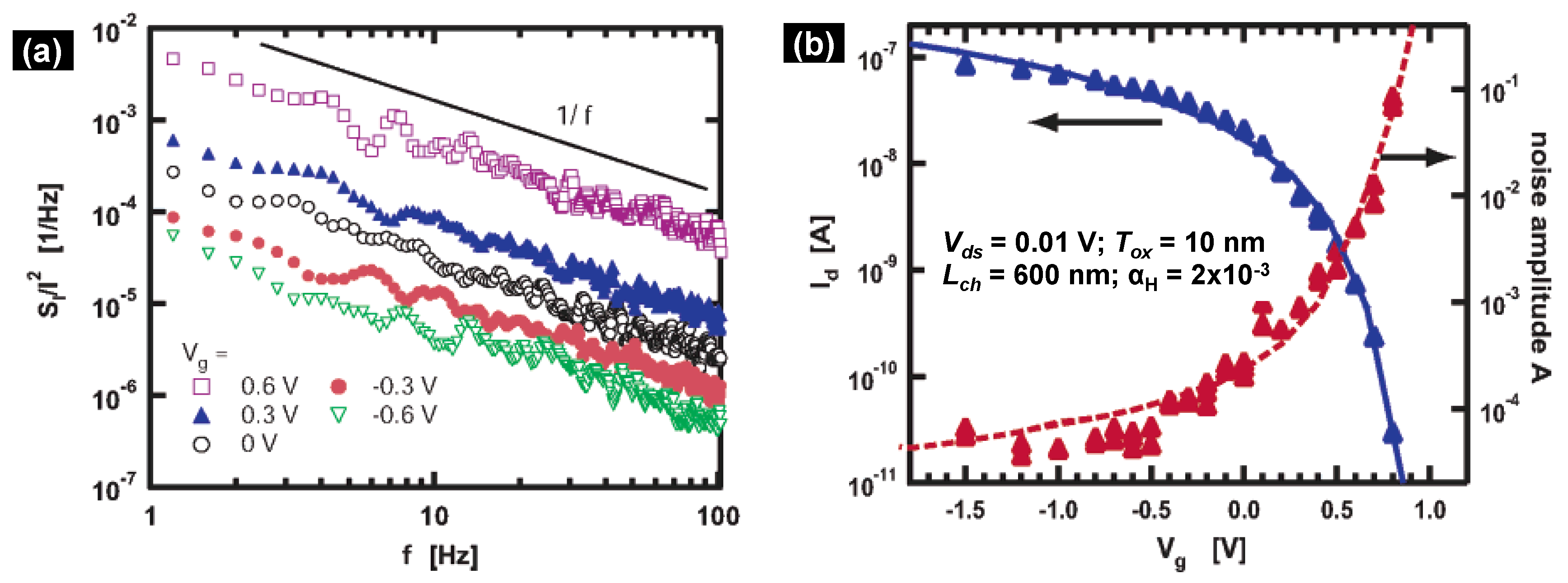 where αH is a fitting parameter that varies from device to device. Equation (3) suggests a reduction in noise amplitude A with the increase in carrier number or Ids, as measured for the p-type FET for different Vg (Figure 15b) [134].