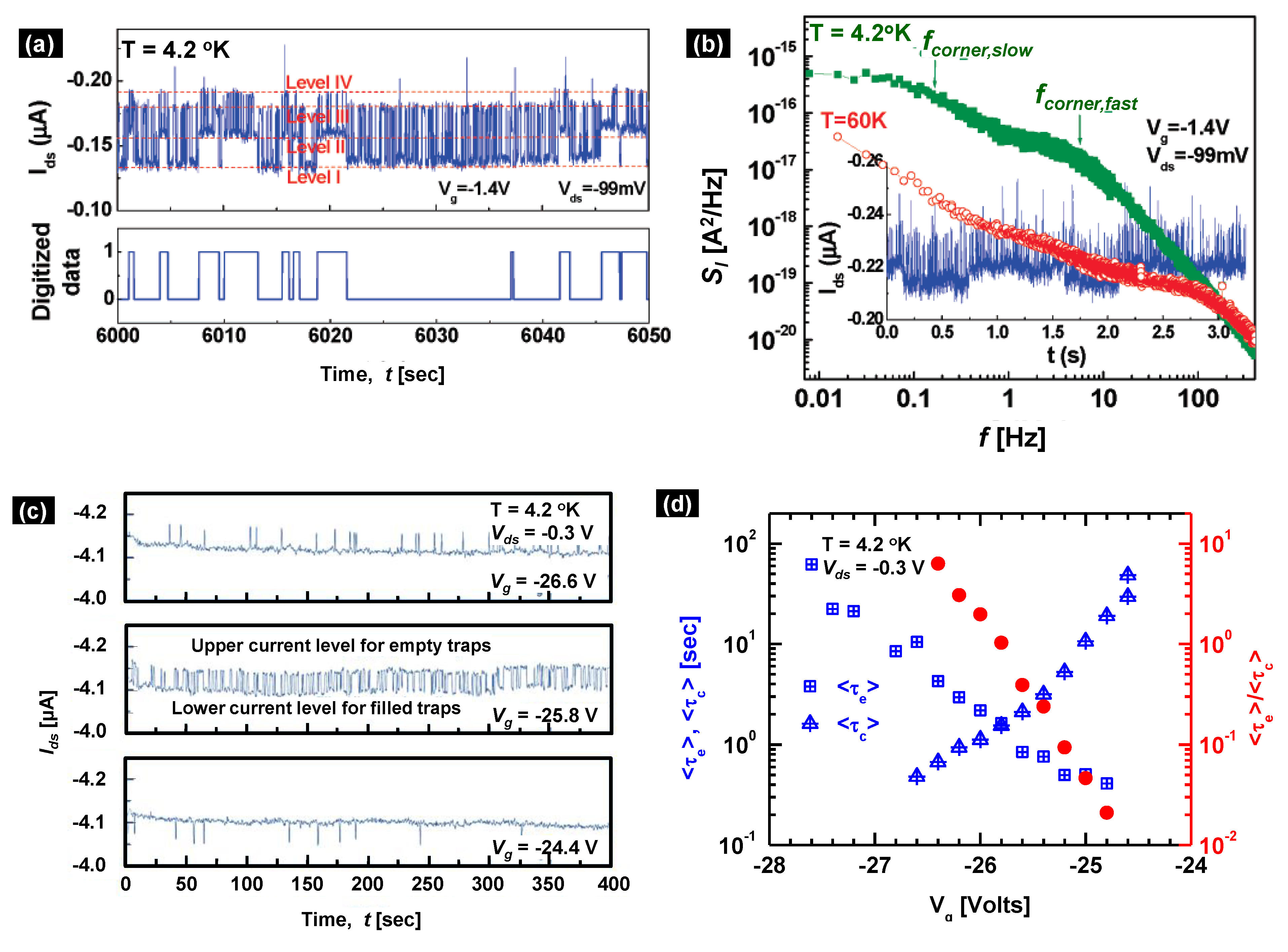 Noise measurements in cryogenic conditions reduce thermal noise and also freeze-off some of the defects that contribute to noise at higher temperatures. Responses from the remaining few oxide defects result in random telegraph noise (RTN) with stochastic variation in Ids and discrete current levels [137,141,142,143]. Figure 16a shows RTN obtained from a SWNT-FET (measured at T = 4.2 °K) suggesting four major switching levels resulting from a slow switching defect (whose fluctuation is digitized in the bottom of Figure 16a) and a fast switching defect [142]. Corresponding power density spectrum for these fluctuations is shown in Figure 16b that suggests two overlapping Lorenzian spectrums with corner frequencies (fc) at 0.2 Hz (for the slow defect) and 5.8 Hz (for the fast defect). At higher temperatures (T = 60 °K), however, responses from these two defects are mixed up (inset of Figure 16b) and noise from new defects (with higher fc) shows up. Similar noise analysis at different Vg (Figure 16c) enables one to extract distributions of capture time τc (defined as the time required for a high to low transition in Ids) and emission time τe (defined as the time required for a low to high transition in Ids). These distributions are used to calculate the averages of capture and emission times (<τc> and <τe>) at different Vg (Figure 16d) and, hence, the location of defect causing RTN from the slope of ln(<τe>/<τc>) vs. Vg plot [137].