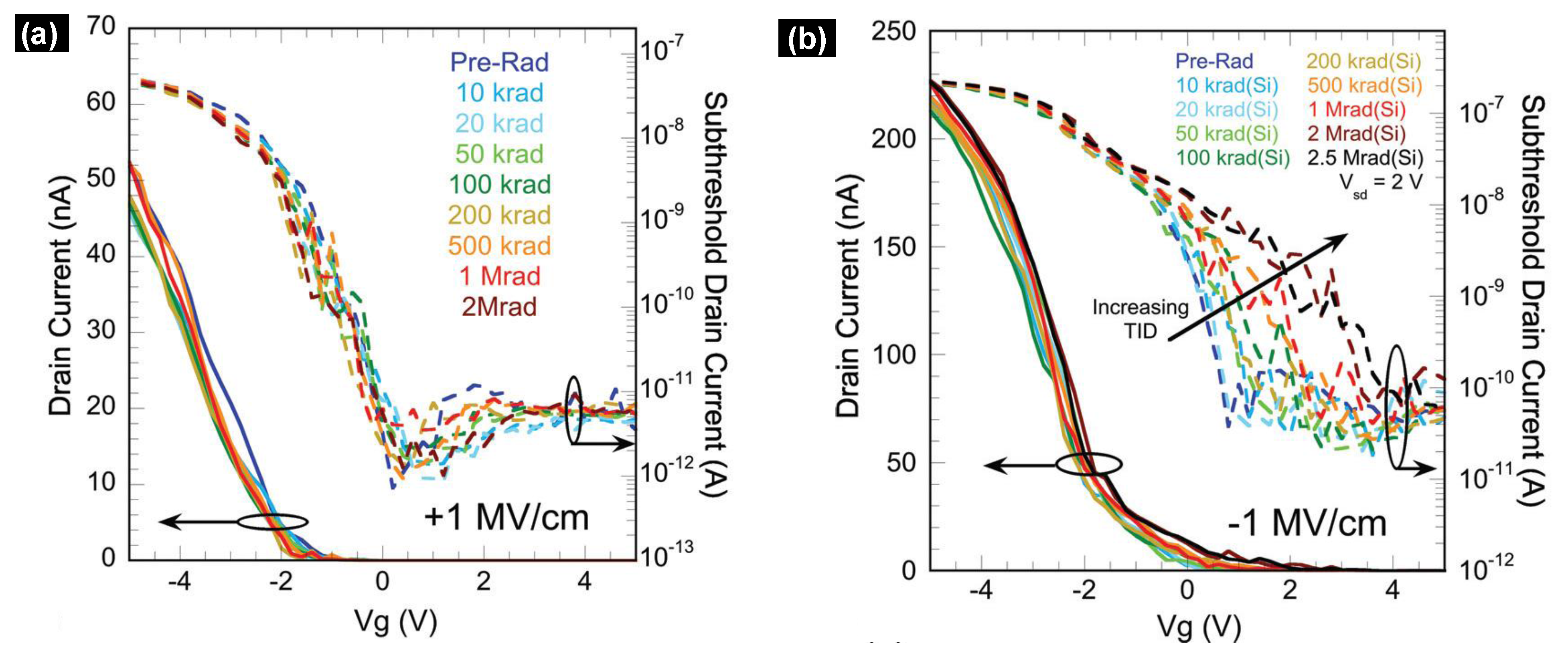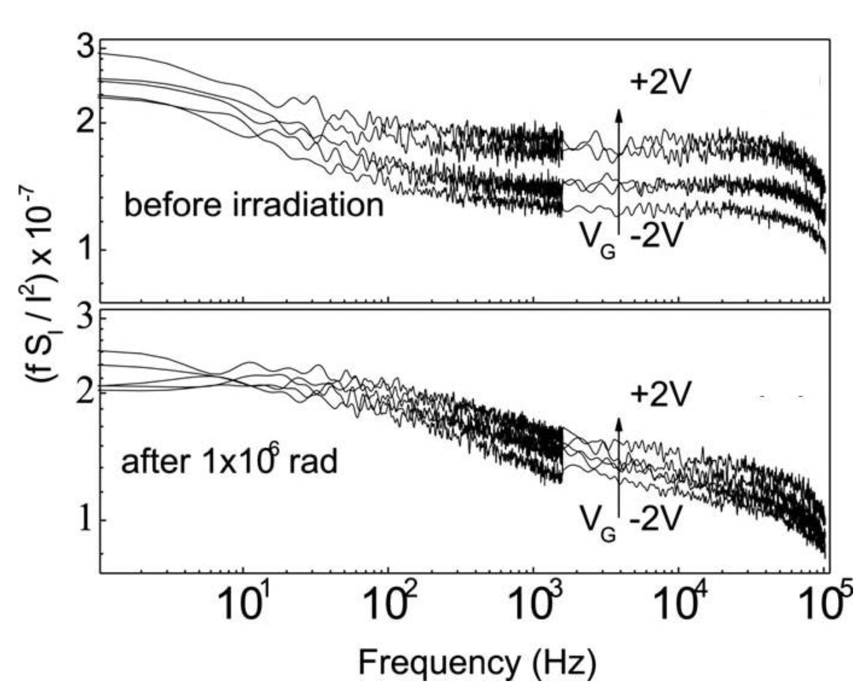 Measured noise power spectral density at different Vg before and after gamma radiation (reprinted with permission from Ref. [133]; © 2010, AIP Publishing LLC).