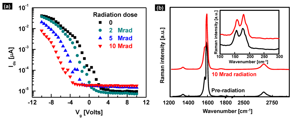 - Cress, C.D.; McMorrow, J.J.; Robinson, J.T.; Friedman, A.L.; Landi, B.J. Radiation effects in single-walled carbon nanotube thin-film-transistors. IEEE Trans. Nucl. Sci. 2010, 57, 3040–3045. [Google Scholar]