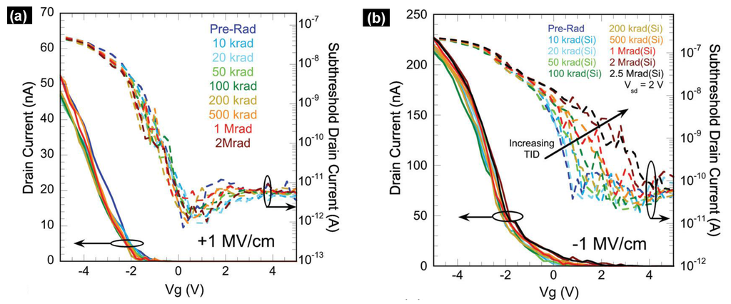 - Hughes, H.L.; Benedetto, J.M. Radiation effects and hardening of MOS technology: Devices and circuits. IEEE Trans. Nucl. Sci. 2003, 50, 500–521. [Google Scholar] [CrossRef]