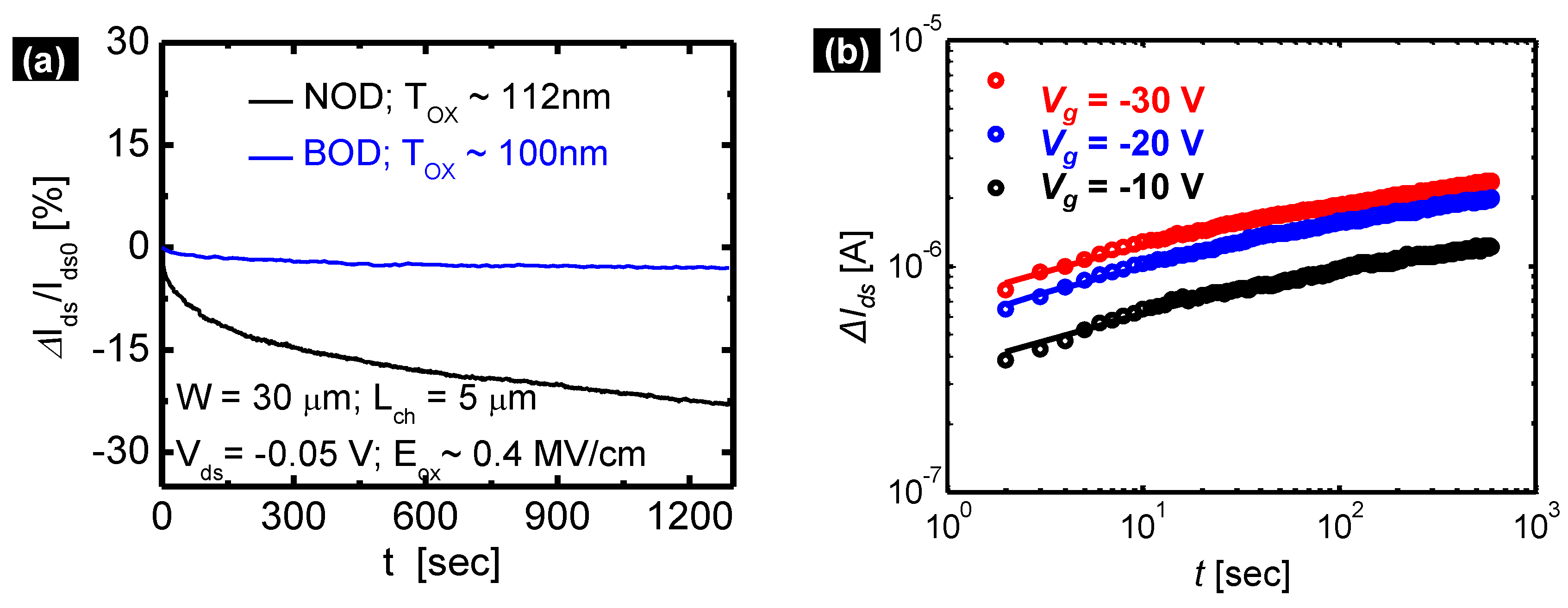 - Islam, A.E.; Kufluoglu, H.; Varghese, D.; Mahapatra, S.; Alam, M.A. Recent issues in negative bias temperature instability: Initial degradation, field-dependence of interface trap generation, hole trapping effects, and relaxation. IEEE Trans. Electron Devices 2007, 54, 2143–2154. [Google Scholar] [CrossRef]