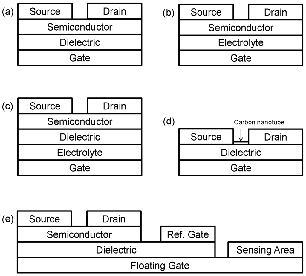 Simplified diagrams of various types of organic thin-film transistor (OTFT): (a) organic field effect-transistor (OFET) (bottom-gate, top-contact version shown); (b) electrolyte-gated organic field effect transistor (EGOFET); (c) ion-sensitive OFET (ISOFET); (d) carbon nanotube FET (CNTFET); and (e) organic charge-modulated FET (OCMFET).