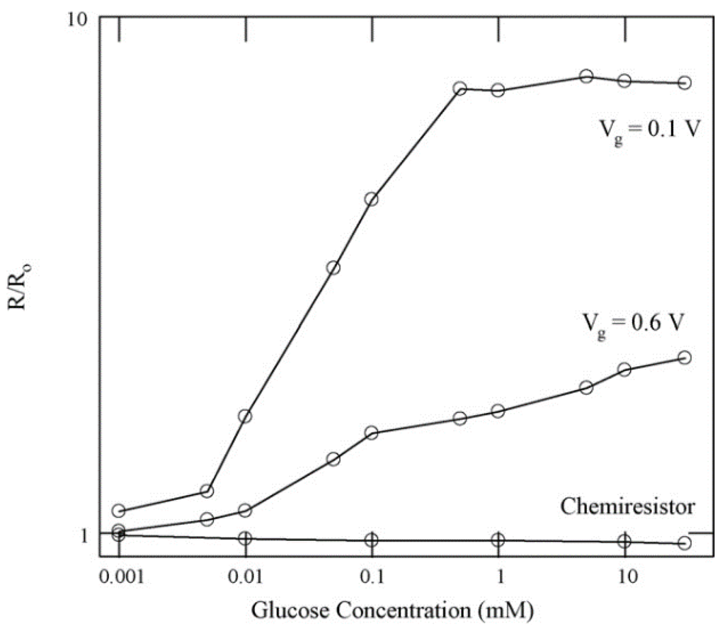 In 2004, Zhu et al. demonstrated an OECT-based sensor in which PEDOT:PSS was the semiconducting layer of the transistors, and a “well” (constructed from polydimethylsiloxane (PDMS)) was formed above the channel of the devices to hold both the analyte solution and a platinum gate electrode, which was suspended in the analyte solution [23]. In 2007, this work was expanded upon when various concentrations of glucose solutions were mixed with GOx and added to the well of the transistors, after which the change in resistance of the PEDOT:PSS layer was measured [20]. The results indicated that the proposed device structure was more effective than a plain “chemiresistor” (i.e., the same device with no gate electrode), since the sensitivity of the device was greatly improved with a voltage applied to the gate (Figure 2), and sensitivity in the micromolar range was achieved. In a subsequent paper using devices of a similar structure, the “offset voltage” (the difference between the applied VG and the effective VG “seen” by the device) was found to depend on glucose concentration and was used as the dependent variable in calibration curves [24].