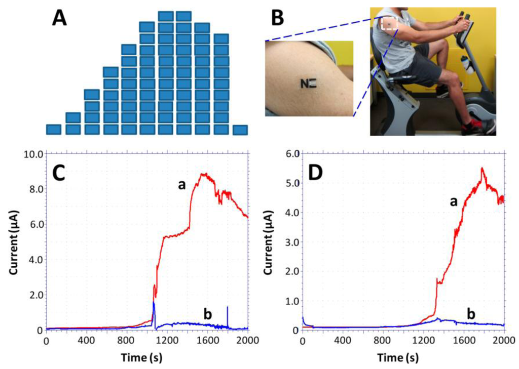 (a) The intensity profile of an exercise routine; (b) a photograph of the lactose-sensing transfer tattoo; and (c,d) current versus time for the devices with (red) and without (blue) the enzyme present whilst the athlete is performing the exercise routine with the intensity profile shown in (a).