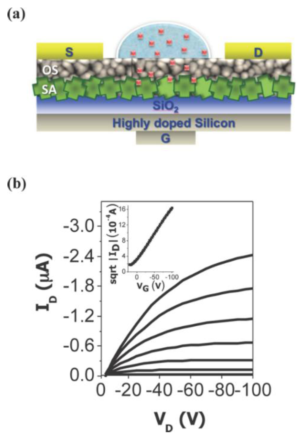 (a) Cross-sectional diagram of functional bio-interlayer (FBI)-OFET with a streptavidin layer for the detection of biotin; (b) the output characteristic of the biotin-sensing FBI-OFET. Reproduced from [36].