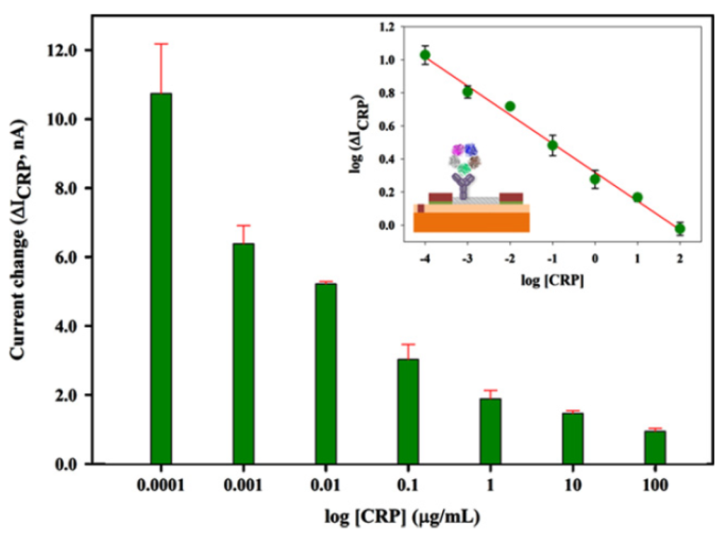 Justino et al. have recently reported a C-reactive protein (CRP) detecting NTFET, capable of sensing analyte concentrations of 10−4 to 102 μg∙mL−1 [11]. This range of concentrations covers the critical range of around one to 10 μg∙mL−1, in which CRP is an important biomarker for conditions, such as cardiovascular disease. The use of a simple OTFT-based sensor is appealing, as many conventional detection methods (immunoassays) for CRP are expensive. This NTFET-based device utilizes CRP antibodies by immobilizing them on the surface of the CNT joining the source and drain electrodes, and the change in current between the source and drain when different concentrations of CRP were deposited on top of the device was used as the calibration parameter (Figure 5).